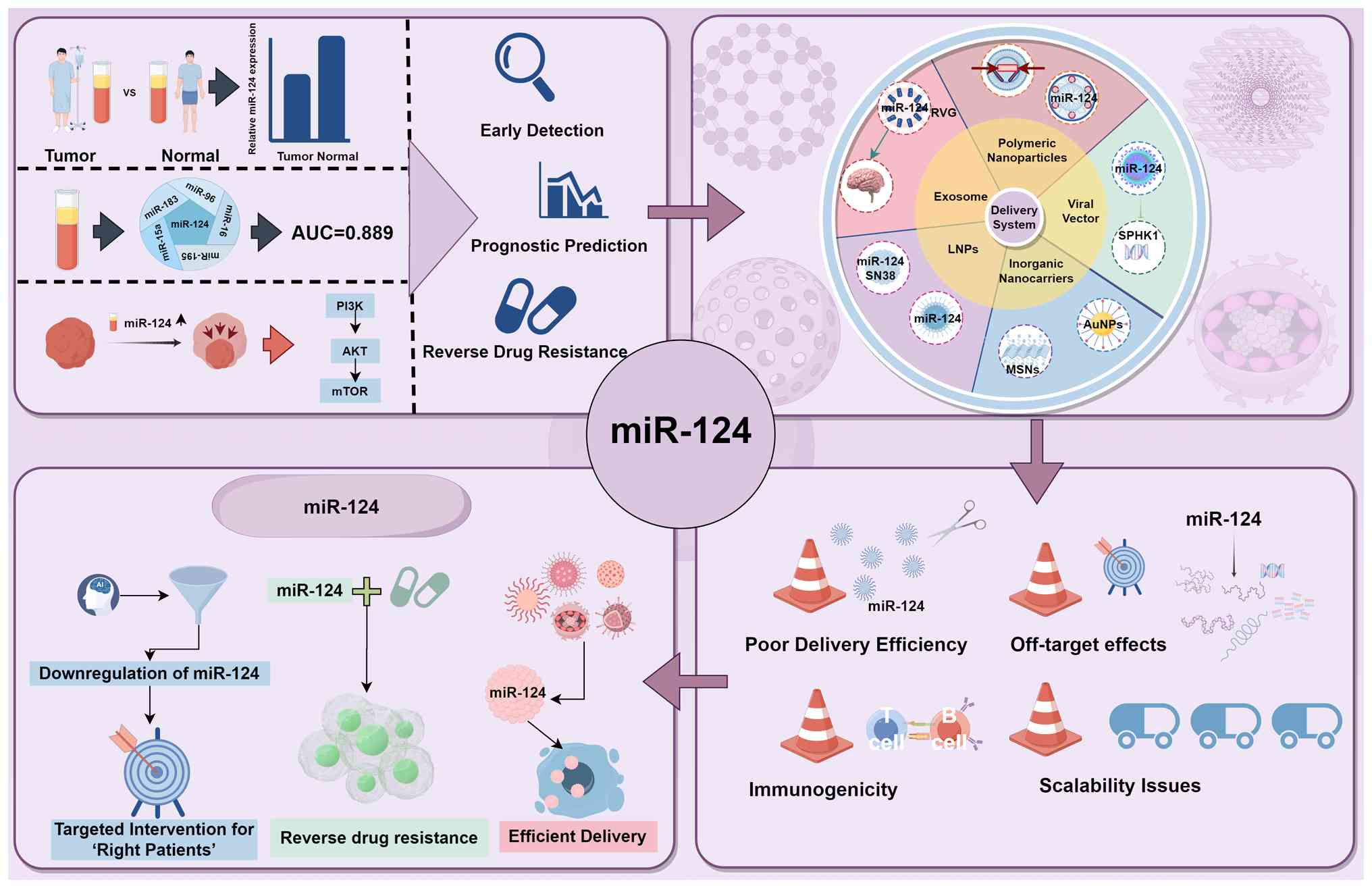 In conclusion, miR-124 is a multifunctional molecule with integrated diagnostic, prognostic and therapeutic guidance capabilities, offering significant promise for the clinical management of cancer. However, the therapeutic efficacy of most related research is currently restricted to the preclinical stage due to several significant challenges, including suboptimal in vivo delivery efficiency, insufficient tissue targeting specificity, and inadequate molecular stability. Future research should prioritize the development of efficient and safe targeted delivery systems, such as lipid nanoparticles (LNPs) or exosomal vectors. Furthermore, it is imperative to elucidate the critical role of miR-124 within tumor drug resistance networks and its synergistic interactions with current chemotherapeutic and targeted agents. Moreover, research should focus on developing precise therapeutic strategies based on molecular subtyping to identify patient subgroups that are most likely to benefit from miR-124-based interventions. Investigating miR-124-based gene therapies or oligonucleotide drugs will be essential for translating these findings from the bench to the bedside.
