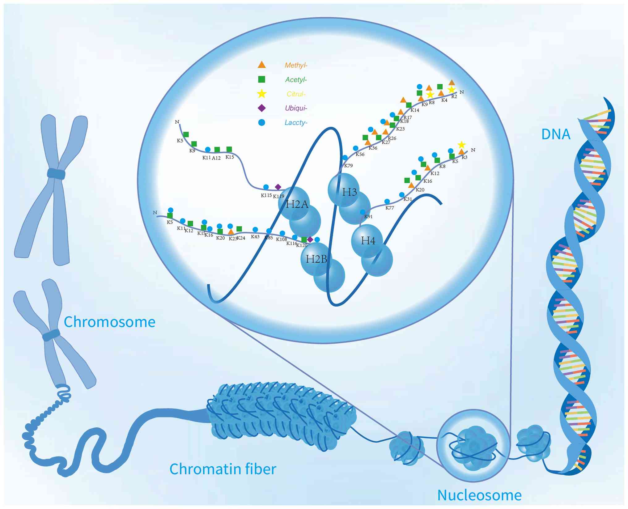 Histones are fundamental proteins that reside in the nucleus of eukaryotic cells. They make up the core elements of nucleosome subunits, which are made up of an octamer of four core histones (H3, H4, H2A and H2B) surrounded by a 147-base-pair DNA segment (23). Each histone has a unique side chain or tail, which is highly enriched in lysine and arginine residues (24). These changes alter the charge density between histones and DNA, allowing the precise regulation of chromatin transcription (Fig. 1). They are one of the core mechanisms behind the epigenetic changes that regulate gene activation or suppression without altering the underlying DNA sequence. Histone modifications take numerous forms, including methylation, acetylation, ubiquitination and lactylation (25).