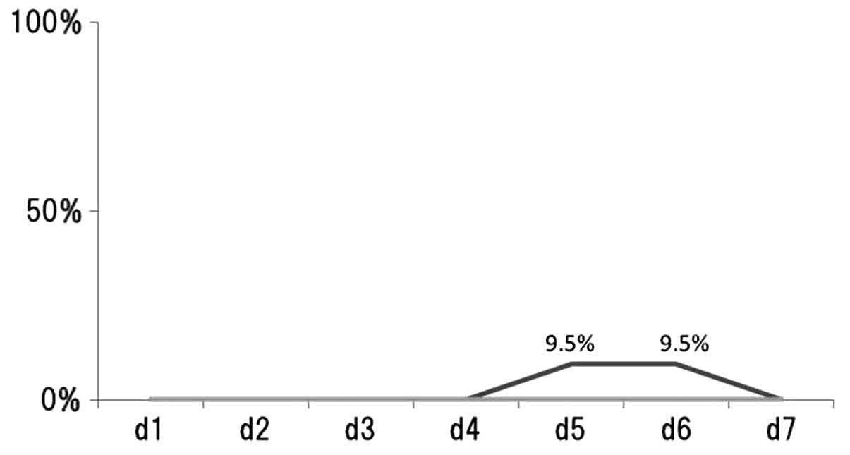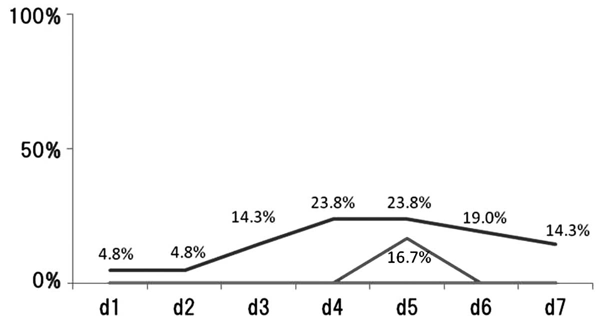 The percentage of patients reporting nausea/day following chemotherapy treatment was recorded (Fig. 1). Regarding nausea, 10 (32.3%) of the 31 patients exhibited the complication between days 1–7. In patients treated with CDDP-regimens, the incidence of nausea on each day was: day 1, 4.8%; day 2, 4.8%; day 3, 14.3%; day 4, 23.8%; day 5, 23.8%; day 6, 19.0% and day 7, 14.3%. In patients treated with CBDCA-regimens, the incidence of nausea on each day was: days 1–4, 0%; day 5, 16.7% and day 6–7, 0%. In patients treated without platinum-regimens, the incidence of nausea on days 1–7 was 0%.