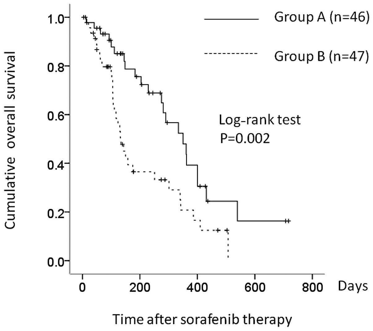 The baseline characteristics of the two groups are shown in Table I. Group A comprised 37 males and 9 females, with a median age of 70 years (range, 46–86). Group B comprised 35 males and 12 females, with a median age of 71 years (range, 47–89). With regard to tumor characteristics, 22 patients in group A and 19 patients in group B had extrahepatic metastases, while 29 and 27 patients were classified with BCLC stage C disease in groups A and B, respectively. Most patients had received previous therapies for HCC: one or more sessions of TACE had been performed in 75 patients, radiofrequency ablation or percutaneous ethanol injection therapy in 27, hepatectomy in 15 and palliative radiation therapy in 16 patients. With regard to pretreatment liver function, 73 patients (78.5%) had Child-Pugh A and 20 (21.5%) had Child-Pugh B function. The incidence of patients with Child-Pugh A status was significantly higher in group A compared to group B (P=0.003).