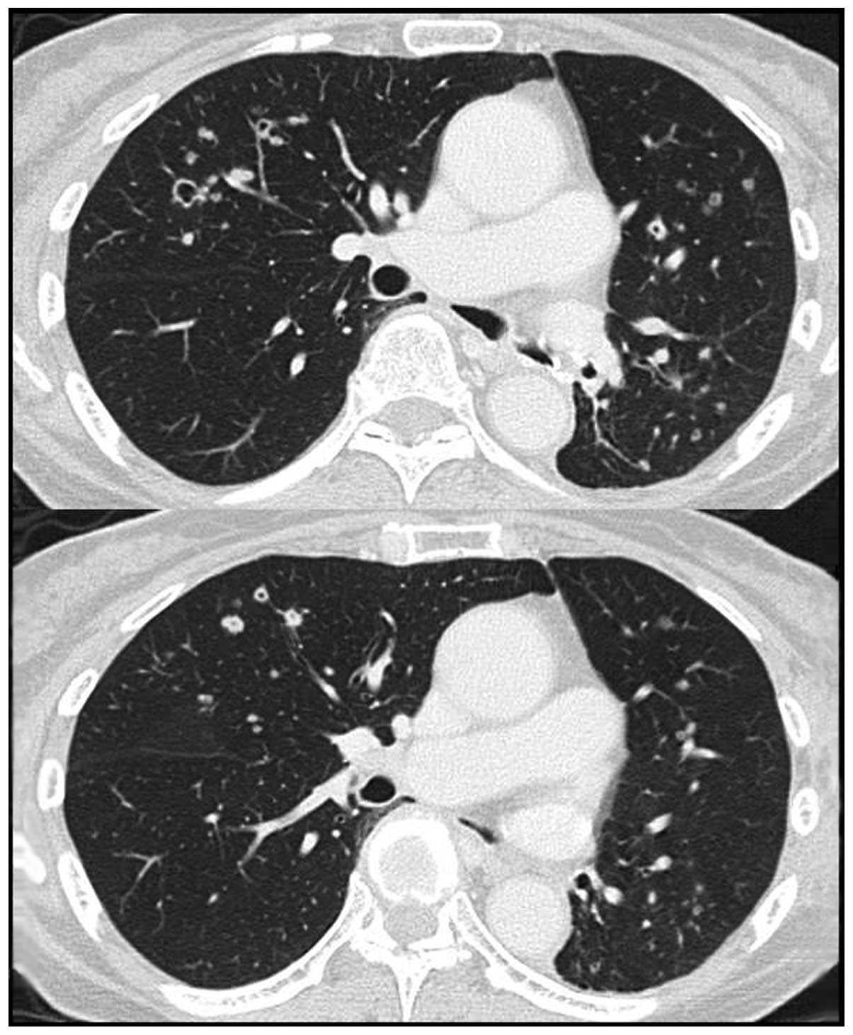 Honda O, Tsubamoto M, Inoue A, et al: Pulmonary cavitary nodules on computed tomography: differentiation of malignancy and benignancy. J Comput Assist Tomogr. 31:943–949. 2007. View Article : Google Scholar : PubMed/NCBI