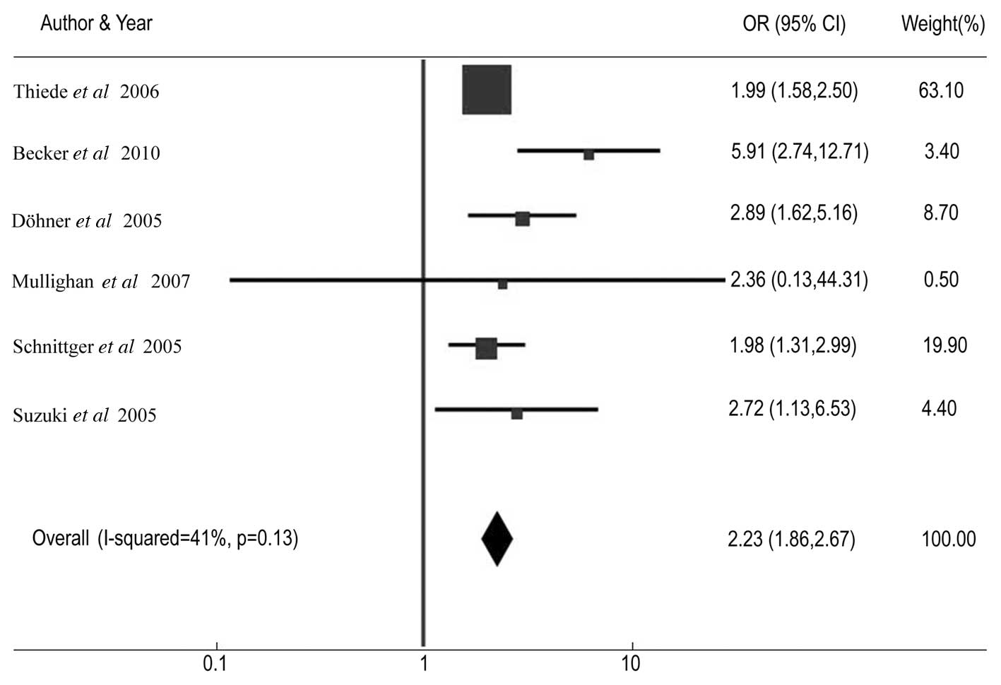 Studies were eligible for inclusion in the meta-analysis if they were: i) original articles written in English and published up to January 2013; ii) dealt only with untreated AML patients; iii) offered survival information based on the NPM1 status, including, NPM1 mutations and NPM1-wild-type (NPM1-wt), and iv) provided survival information on response to induction therapy, including, complete remission (CR), disease-free survival (DFS) and/or OS. Studies were excluded if they focused exclusively on acute promyelocytic leukemia. Multiple reports of a single study were considered as one publication, and only the most recent article was examined.