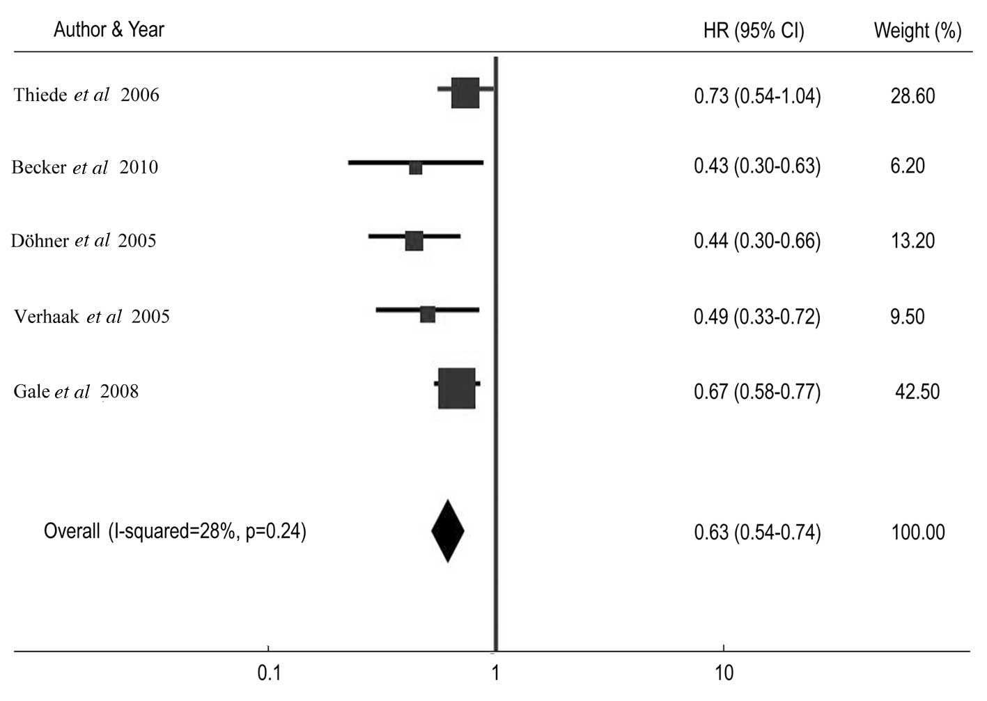Table III shows the CR rate and HR for DFS and OS among AML patients with NPM1 mutations compared with patients without the mutations in individual studies. The summary OR for CR in the NPM1 mutant group was 2.23 (95% CI: 1.86–2.67, P<0.001) (Fig. 2). The summary HR for DFS of NPM1-mt/NPM1-wt was 0.67 (95% CI: 0.58–0.78; P<0.001) (Fig. 3), and the overall HR for OS of NPM1-mt/NPM1-wt was 0.63 (95% CI: 0.54–0.74; P<0.001) (Fig. 4). The test for heterogeneity, which evaluates the variation in study outcomes between studies in a meta-analysis, showed no significant heterogeneity among studies included in the DFS analysis (Q=4.08, df=4, P=0.40, τ2=2) and OS analysis (Q=5.52, d=4, P=0.24, τ2=28).