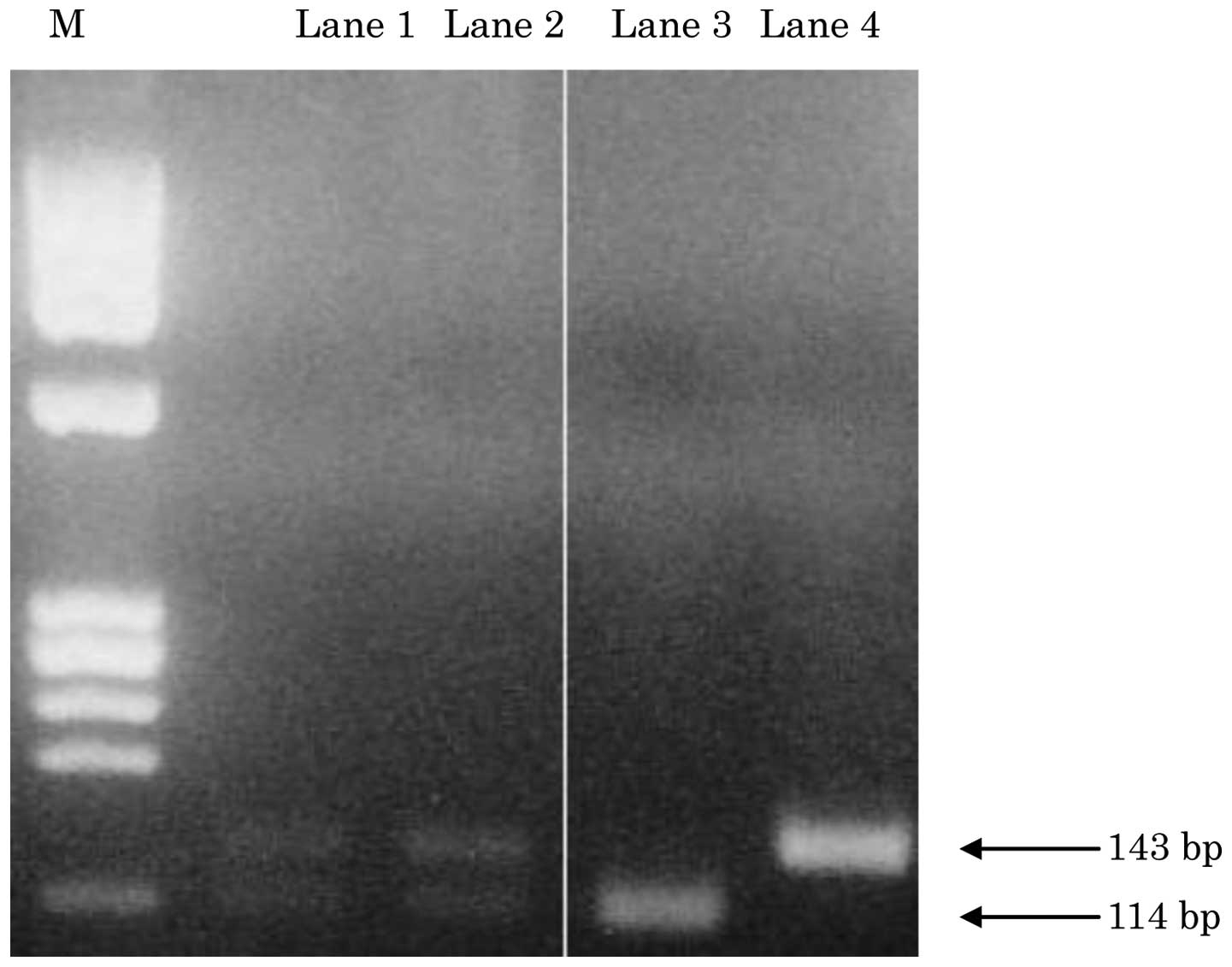 Analysis of K-ras codon 12 mutations using polymerase chain reaction-restriction fragment length polymorphism (PCR-RFLP) in unresectable advanced colorectal carcinomas. PCR products were digested with the restriction enzyme MvaI. The wild-type and mutant fragments were detected at positions corresponding to 114 and 143 bp. Lanes 1 and 2 show a mutant band; lane 3, negative control; lane 4, positive control and M, HaeIII DNA marker.