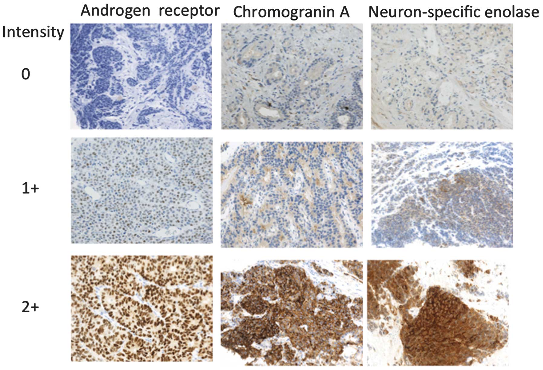 The staining intensity was graded as negative, 0; positive, 1+ and strongly positive, 2+ (Fig. 1). The proportion of 1+ and 2+ areas in the PCa cells was determined. These analyses were carried out by an experienced pathologist (T.T.). PCa was regarded as NED if ≥50% of the tumor cells were positive for CGA and/or NSE. In addition, PCa was regarded as strong NED if ≥50% of the tumor cells were 2+ for CGA and/or NSE.