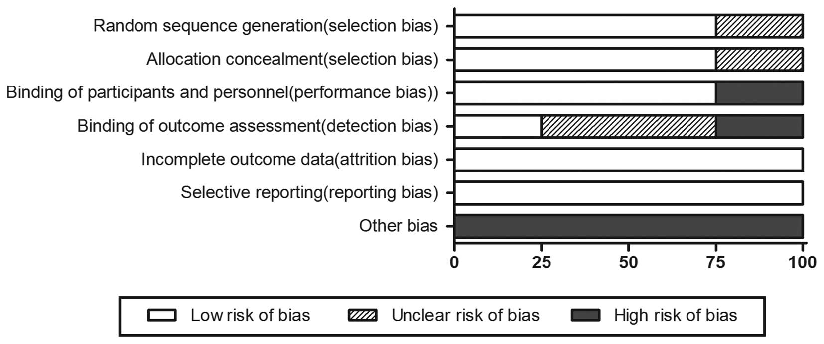 A total of 2,224 relevant articles were retrieved. The study selection process is summarized in Fig. 1. We selected 77 clinical trials that investigated TRAIL-related agents for cancer treatment, of which 73 articles were excluded as they were reference abstracts without a detailed data report or were studies other than RCTs. Two reviewers confirmed 4 RCTs (13–16) as being suitable for inclusion in this meta-analysis. The general characteristics of the eligible RCTs are summarized in Table I.