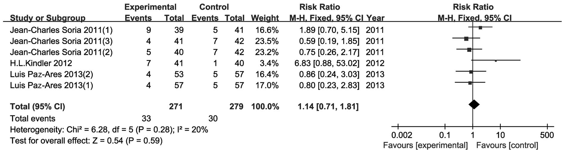 In this meta-analysis, data from 4 RCTs were included. As the subgroup of the 4 RCTs was not consistent, we considered the subgroups as independent clinical trials and analyzed them separately. The data from Soria et al (13) were divided into three parts: i) paclitaxel plus carboplatin (PC) vs. PC + dulanermin; ii) PC and bevacizumab (PCB) vs. PCB + dulanermin (8 mg/kg); and iii) PCB vs. PCB + dulanermin (20 mg/kg). The data from Paz-Ares et al (16) were divided into two parts: i) PC + placebo vs. PC + conatumumab (3 mg/kg); and ii) PC + placebo vs. PC + conatumumab (20 mg/kg).