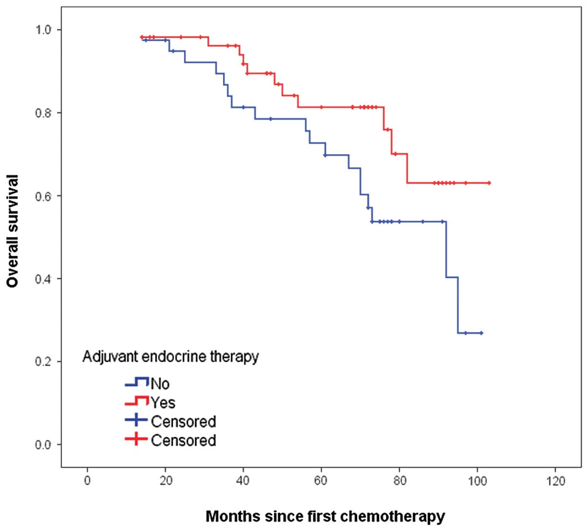 The reliable determination of predictive factors of breast cancer is a prerequisite for selection of optimal therapeutic strategy. Estrogen receptor (ER) and progesterone receptor are currently the established tumor markers guiding routine use of endocrine therapy (ET). Neoadjuvant chemotherapy (NAC) is the standard treatment in the early years for patients with locally advanced breast cancer, and thus far, it is an increasingly used option for operable breast cancer (1,2). Certain studies have reported that the ER and progesterone receptor status may alter during the course of NAC (3–6). However, limited studies have been performed regarding whether patients with a hormone receptor change from positive to negative following NAC could gain any benefit from adjuvant ET. The present study aimed to determine whether ET could provide any benefit in this subpopulation of patients with breast cancer.