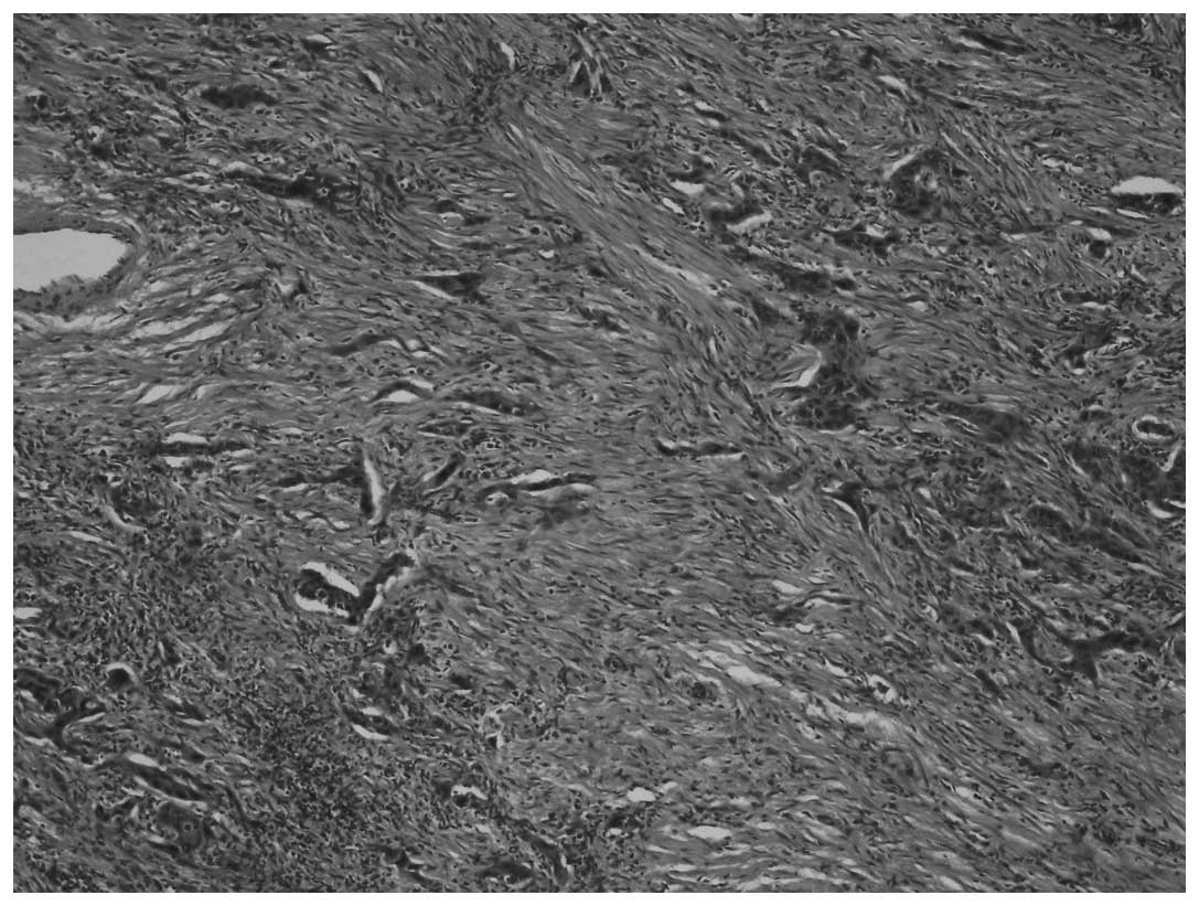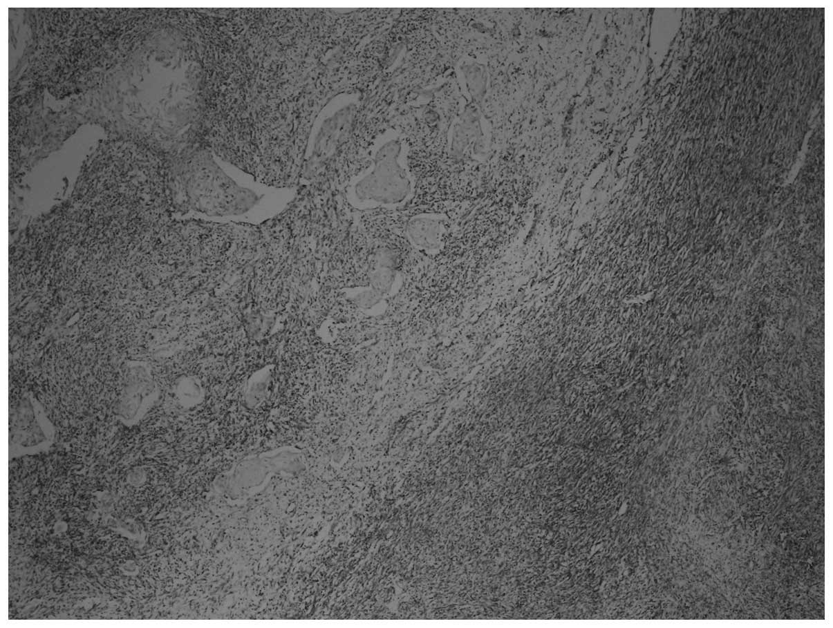 On macroscopic examination, the nephroureterectomy specimen included the left kidney, measuring 18×13×8 mm, a ureteral segment 190 mm in length and a ureteral calculus measuring 25 mm in diameter. The thickness of the renal cortical parenchyma was reduced to 1 mm. Three nodular lesions with irregular margins, brown to dark yellow in color were identified in the kidney, with the largest of the lesions measuring 30 mm in diameter. The total diameter of the nodular lesions was 70 mm. The microscopic examination of the lesions revealed tumor cells with fusiform nuclei and a pink cytoplasm, exhibiting diffuse pleomorphism and areas of necrosis. The mitotic count was 19–20/10 high-power fields. Islands of carcinomatous cells were identified, embedded in a desmoplastic stroma [hematoxylin and eosin (H&E) staining; magnification, x40; Fig. 1]. Sarcomatous areas, composed of pleomorphic fusiform cells with marked atypia were also identified (Fig. 2) (H&E staining, magnification, x40).