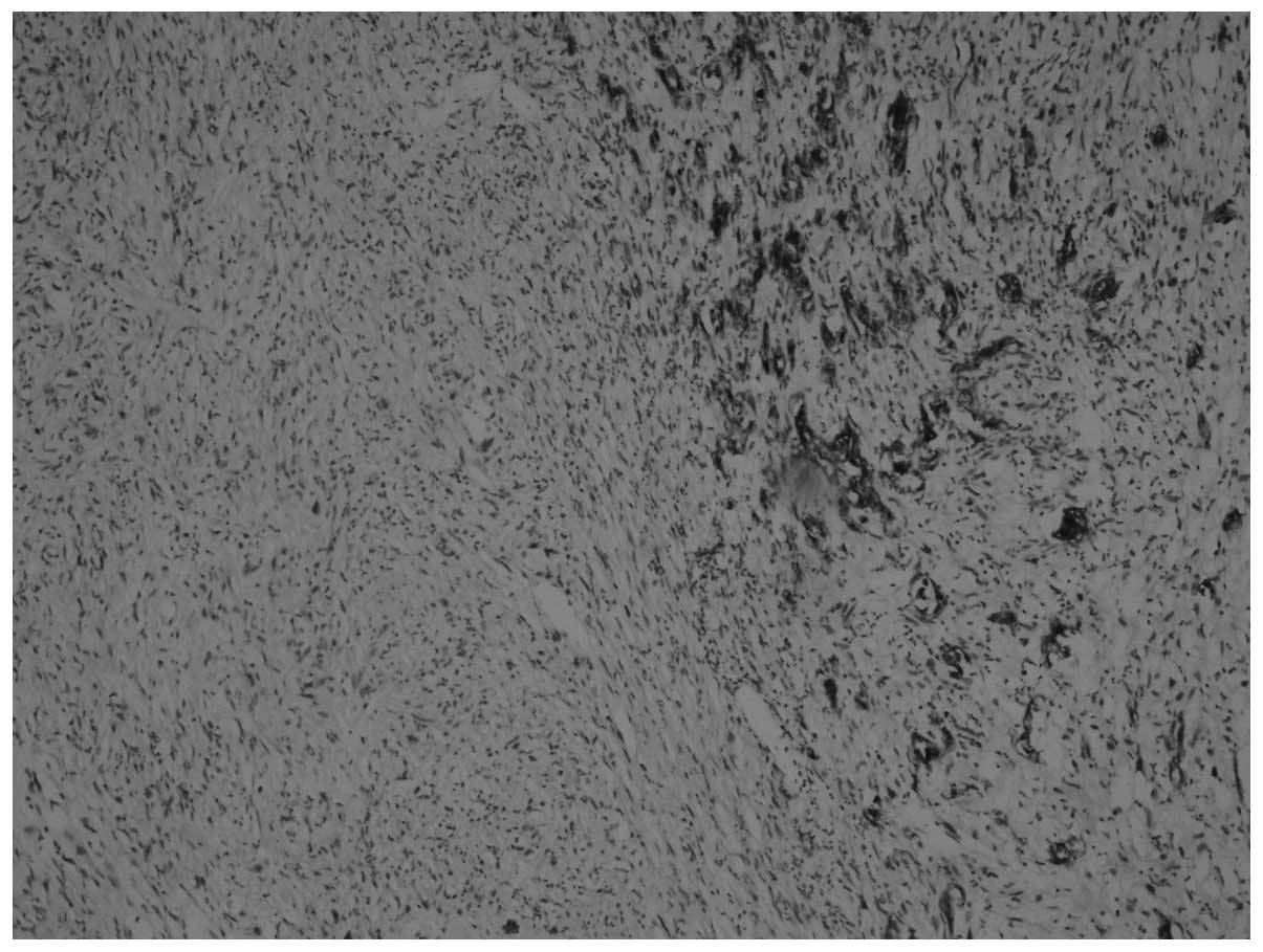 On immunohistochemical examination, the tumor cells were pan-cytokeratin+, DKA+, desmin+, vimentin+, CD117−, CD34− and S-100− (Figs. 3 and 4). The Ki-67 proliferation index was 70%. Sarcomatous components were identified, together with carcinomatous components and transitional zones between the two. The transitional zones between sarcomatous and carcinomatous areas are demonstrated in Figs. 3 and 4, using pan-cytokeratin and vimentin immunostaining, respectively.