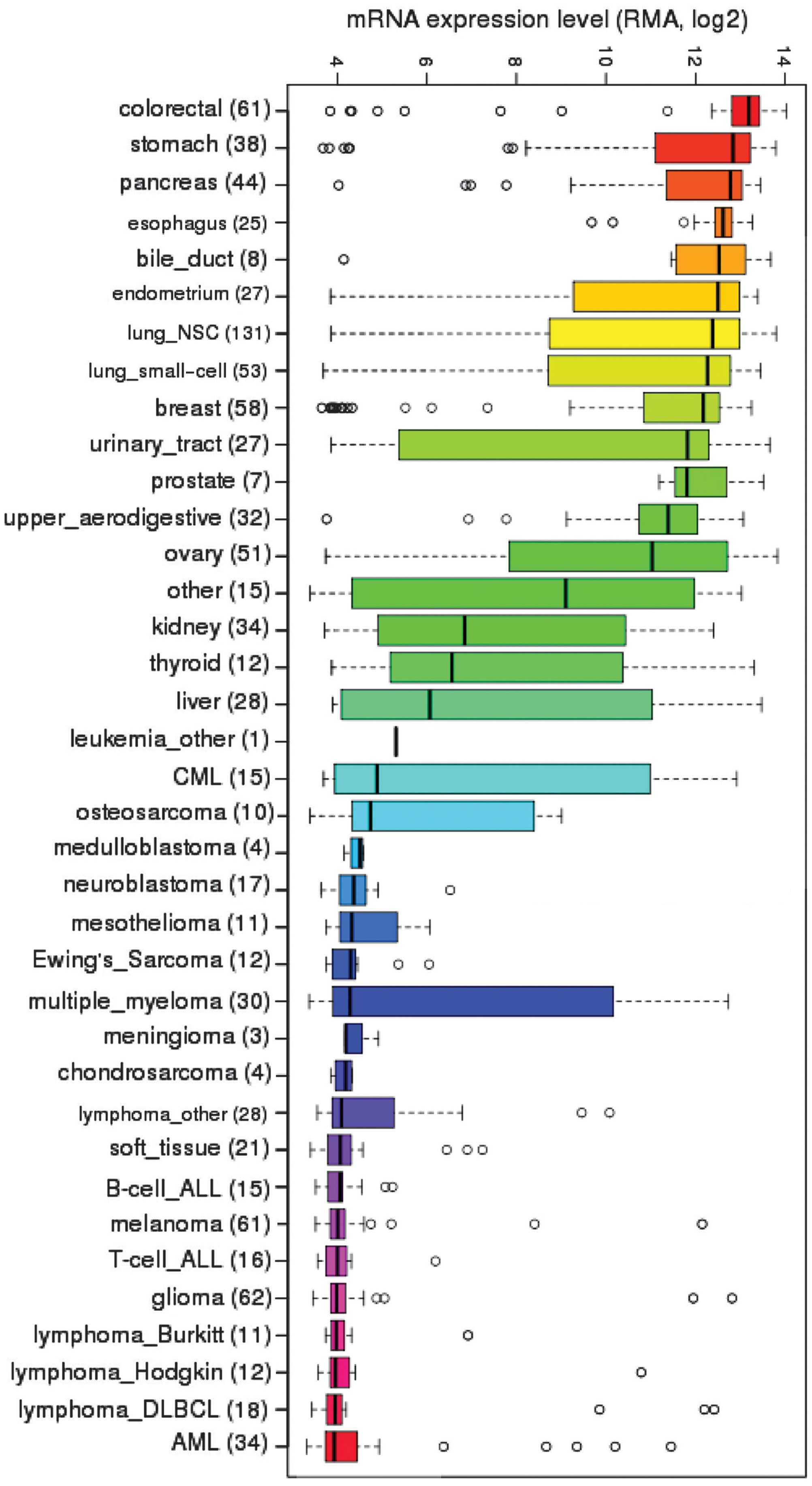 EpCAM has historically been shown to be expressed across epithelial tissues, with a few exceptions (22). Additionally, EpCAM is highly overexpressed across a wide range of carcinomas and was originally described as the dominant antigen in patients with colon carcinoma (23, 24). The expression of this protein has been associated with poor clinical prognosis in patients with a number of carcinomas by functioning as an oncogene and suppressing CD4+ T-cell-dependent immune responses (2, 5, 25, 26). Moreover, use of the EpCAM-specific monoclonal antibody edrecolomab and the tri-functional antibody catumaxomab in patients with metastatic cancers has demonstrated positive antitumor effects (27–30), suggesting that targeting EpCAM may prove to be efficacious against certain carcinomas.