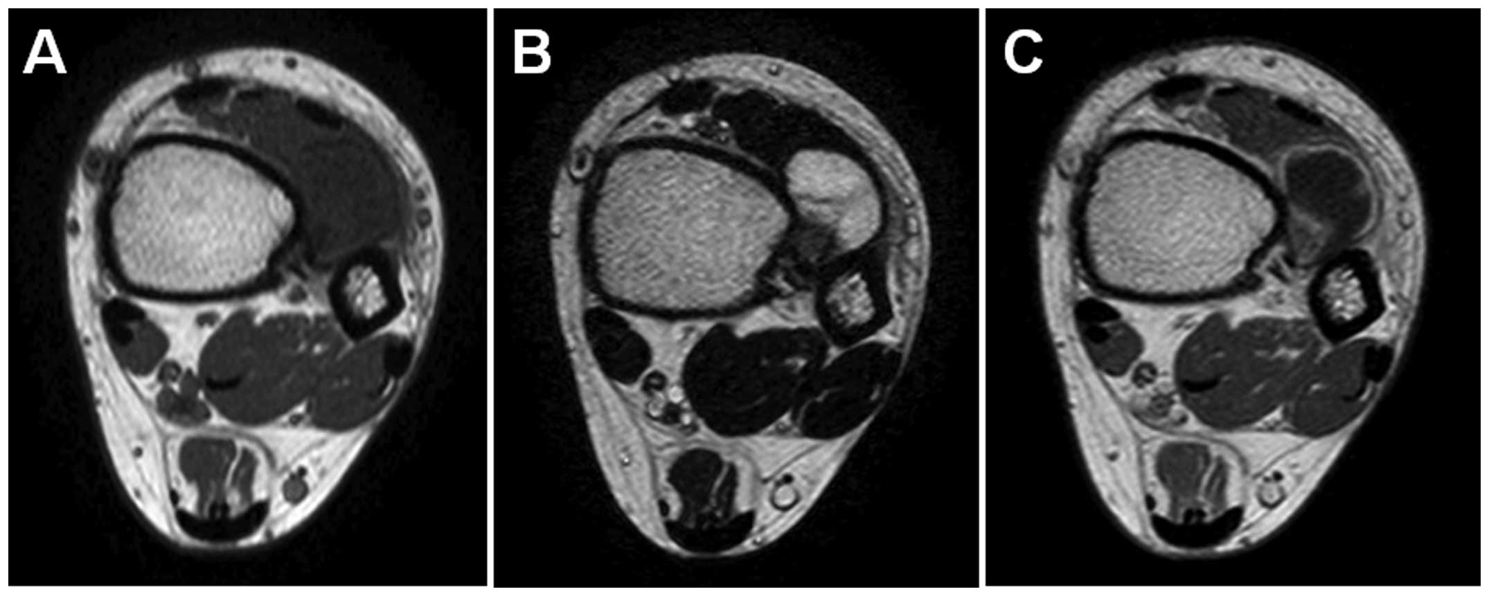 Plain radiographs commonly reveal a discernible soft-tissue lesion with cortical scalloping, underlying cortical sclerosis and overhanging margins (2,5). The lesion may exhibit a sclerotic rim or thin cortical shell. CT is useful in identifying the presence of scattered mineralizationS. On MRI, periosteal chondroma typically appears as a well-circumscribed mass with intermediate signal intensity on T1-weighted sequences and high signal intensity with variable low signal intensity foci on T2-weighted sequences (2,5,6). Intramedullary involvement is quite uncommon, although surrounding soft-tissue edema may occasionally be observed (5). Periosteal chondroma demonstrates predominantly peripheral enhancement following contrast agent administration (6). In our case, the tumor was <3 cm and arose on the surface of the distal tibia. The imaging characteristics were consistent with those described in the literature.