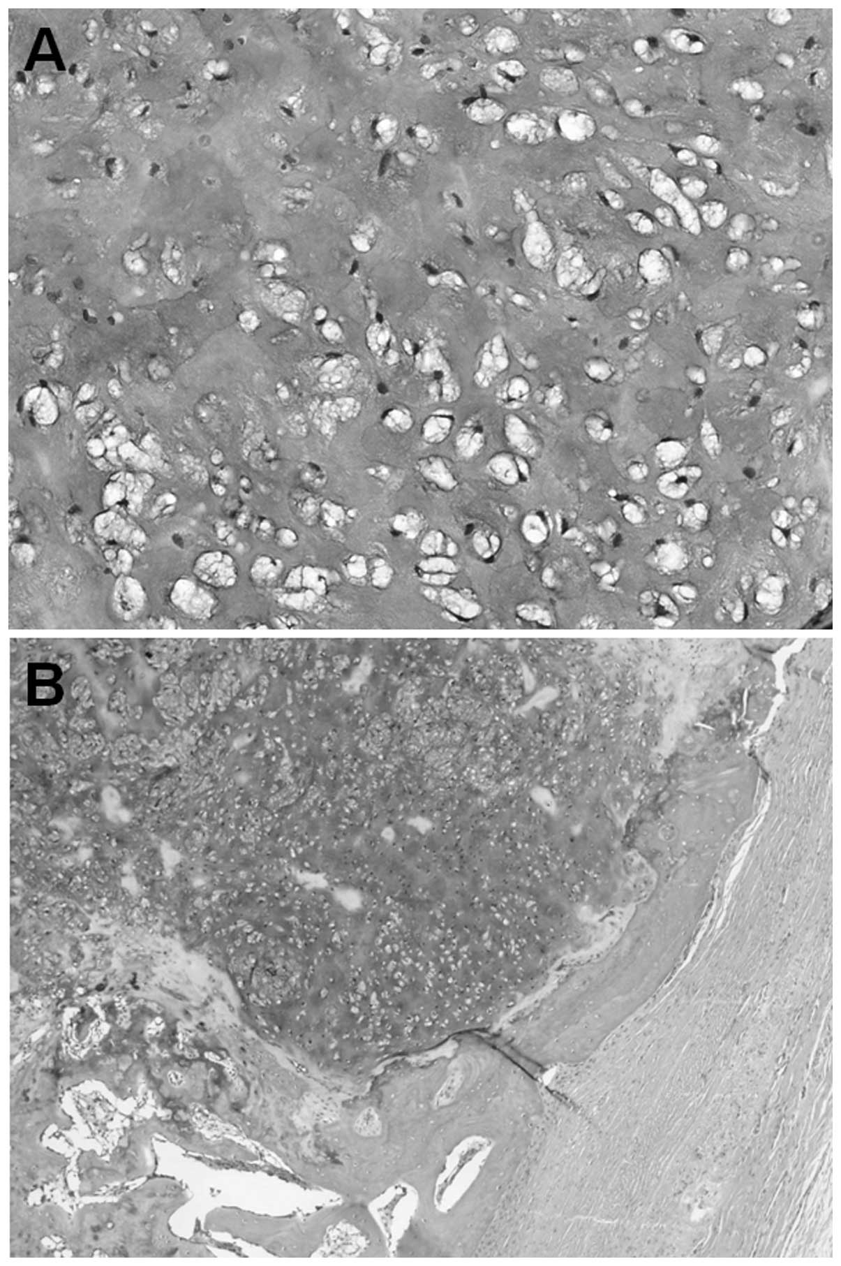 Following an open biopsy, marginal excision with curettage of the underlying bone cortex was performed. Histologically, the tumor was well defined and surrounded by a periosteum-like fibrous capsule. The tumor was composed of a proliferation of chondrocytes in an abundant myxoid or chondromyxoid matrix (Fig. 4A). Foci of ossification with mature bone trabeculae forming a thin shell-like structure were found in the periphery of the tumor (Fig. 4B). The cytoplasm of the tumor cells was strongly positive for periodic acid-Schiff reaction. Alcian blue staining demonstrated an abundanCE OF acid mucin in the stroma. The mindbomb E3 ubiquitin protein ligase 1 labeling index was <1%. There was no nuclear atypia and mitotic figures were not detected. Based on these characteristics, the tumor was diagnosed as periosteal chondroma.