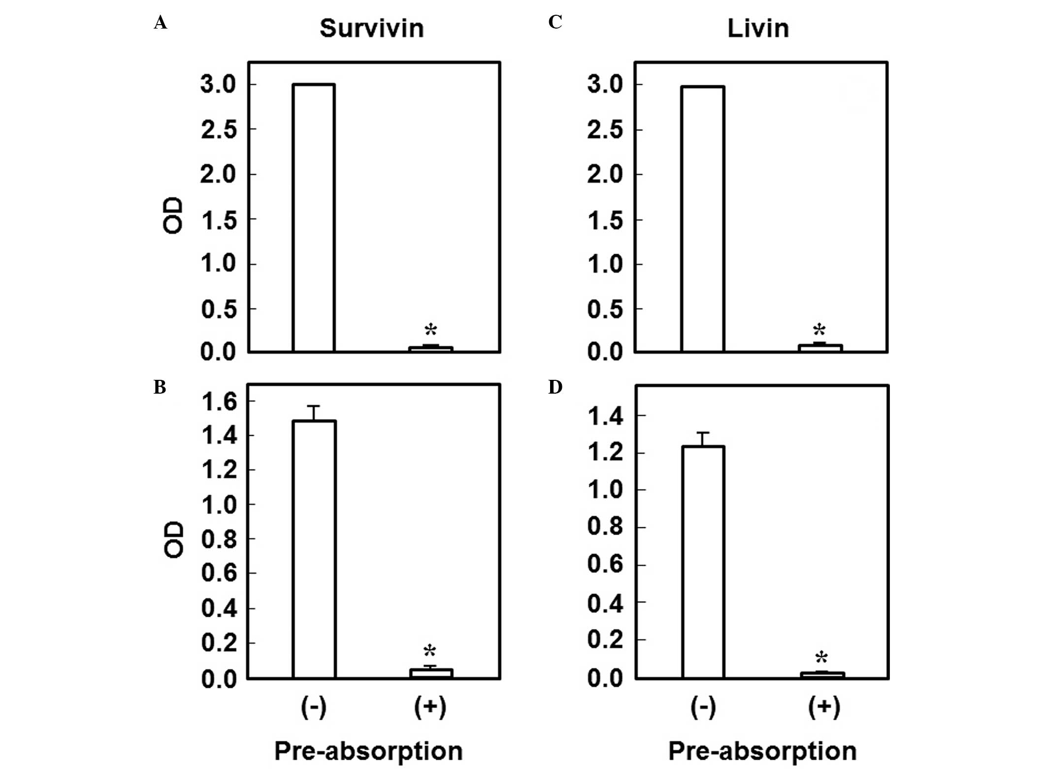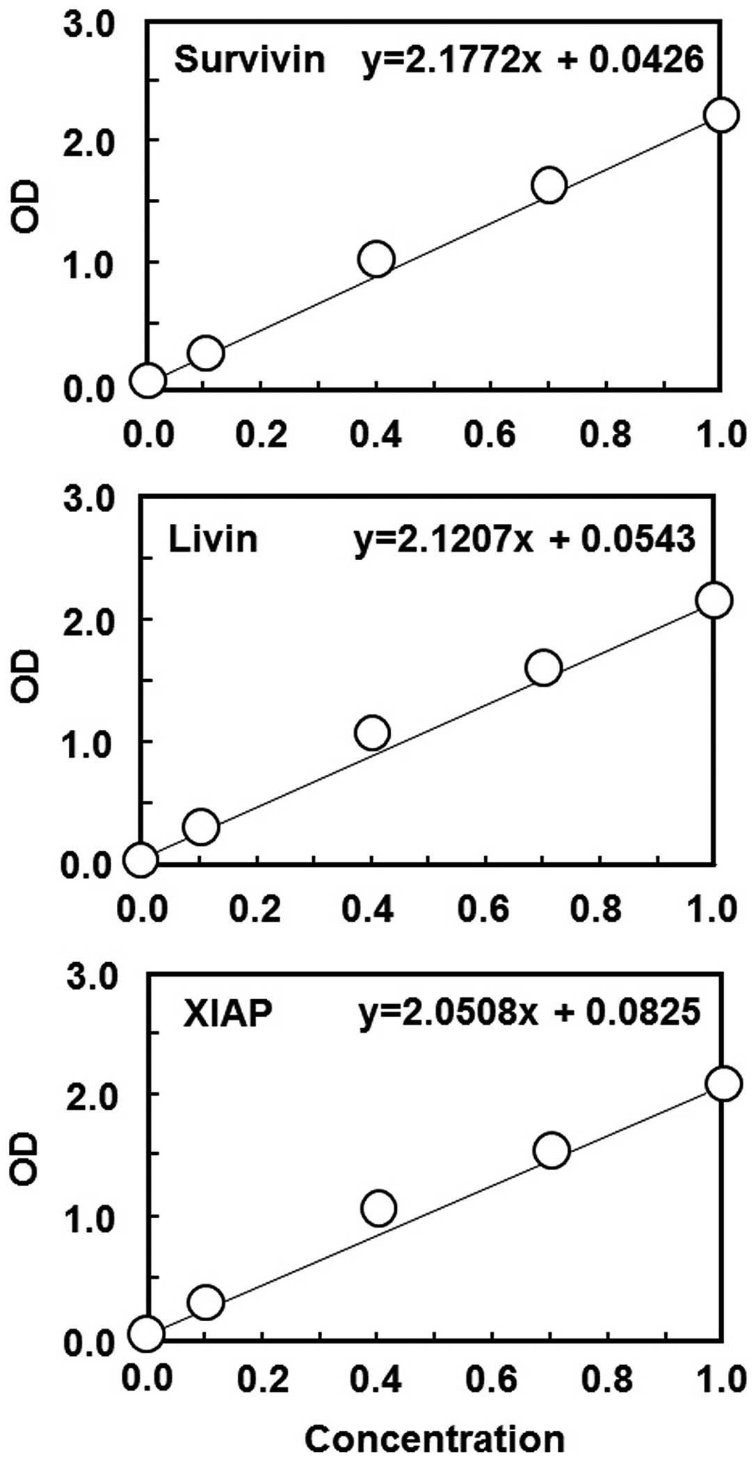 For the pre-absorption test and for drawing standard curves, the purchased antigens and antibodies were as follows: Recombinant human survivin (cat. no. 4160-50; BioVision, Inc., Milpitas, CA, USA), recombinant human livin (cat. no. 01-2103; American Research Products Inc, Grandville, MI, USA), recombinant human XIAP (cat. no. 822-XF-050; R&D Systems, Minneapolis, MN, USA), rabbit-anti human survivin (R&D), mouse anti-human livin (Abcam, Cambridge, MA, USA) and mouse anti-human XIAP (R&D).