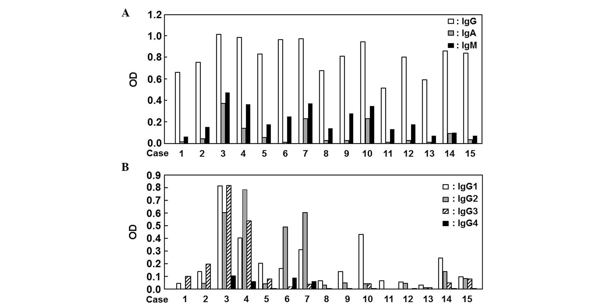 Using sera from 15 patients with colon cancer, we analyzed the subclasses of the anti-survivin autoantibody that reacted to their own recombinant antigens. Among IgG, IgA and IgM, the difference in reactivity was the least for IgG (Fig. 2A). Moreover, the differences in the IgG subclasses were examined and IgG1 exhibited the least significant difference among all patients compared to IgG2, IgG3 and IgG4 (Fig. 2B).
