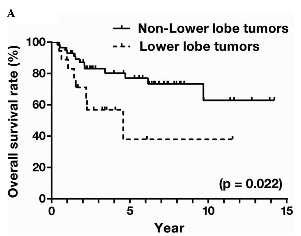 Kudo Y, Saji H, Shimada Y, et al: Do tumours located in the left lower lobe have worse outcomes in lymph node-positive non-small cell lung cancer than tumours in other lobes? Eur J Cardiothorac Surg. 42:414–419. 2012. View Article : Google Scholar : PubMed/NCBI