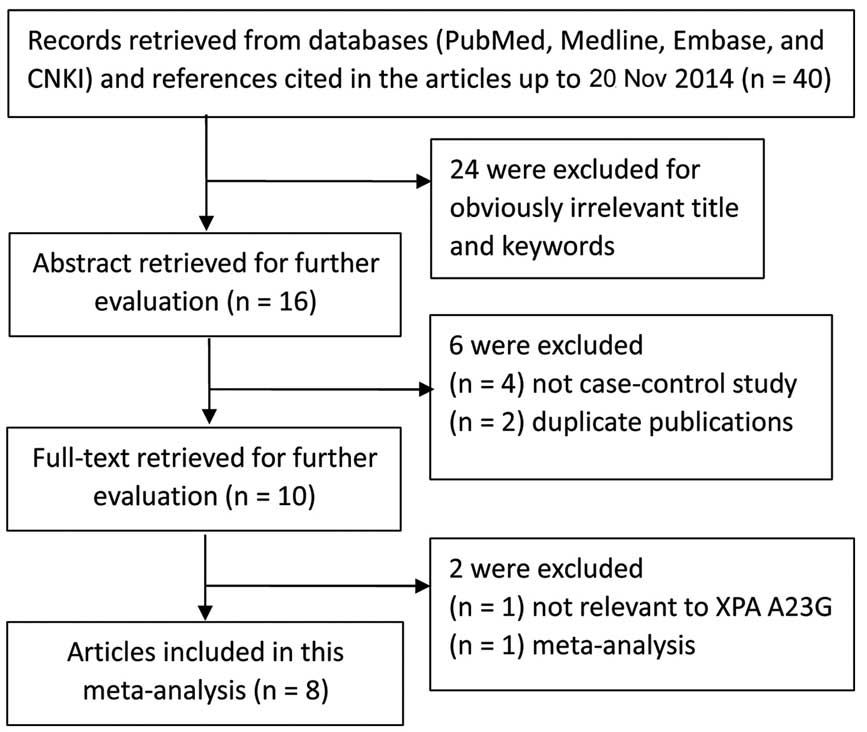 In conclusion, the present meta-analysis provided a more precise estimation of the association between the XPA A23G polymorphism and HNSCC risk compared to independent studies. The results of the meta-analysis indicated that the XPA A23G polymorphism may not be associated with overall HNSCC susceptibility but with oral carcinoma susceptibility, and it may be a risk factor for oral carcinoma; however, the study was a preliminary analysis and should be considered with caution. Further well-designed and large studies are required to clarify this association.