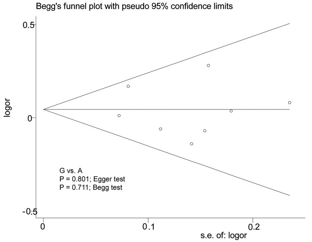 Publication bias of literature was examined using the Egger's test and Begg's test. As presented in Table III, the Egger's test indicated no evidence for publication bias for all the genetic models (all P>0.05), which was confirmed by Begg test (all P>0.05). Fig. 3 showed that the shape of the Begg's funnel plots did not reveal any evidence of clear asymmetry in the allele G vs. A model.