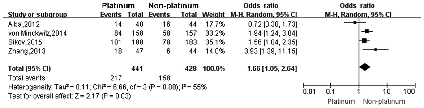 In conclusion, platinum-based chemotherapy in TNBC patients resulted in an improved short-term efficacy compared to the non-platinum-based regimen group. Platinum-based therapy is more effective to triple-negative breast cancer. Future multicenter randomized controlled trials are required to validate these findings and to determine whether platinum-based chemotherapy can extend the survival rate of TNBC patients.