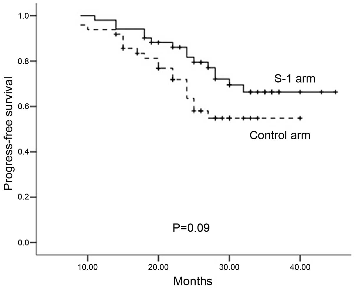 The median follow-up time was 28.4 months (range, 9–50 months). The rates for 2-year PFS (S-1 arm, 81.3%; control arm, 65.8%; P=0.090; Fig. 1) and 2-year OS (S-1 arm, 86.2%; control arm, 82.5%; P=0.103; Fig. 2) did not differ significantly between the two arms.