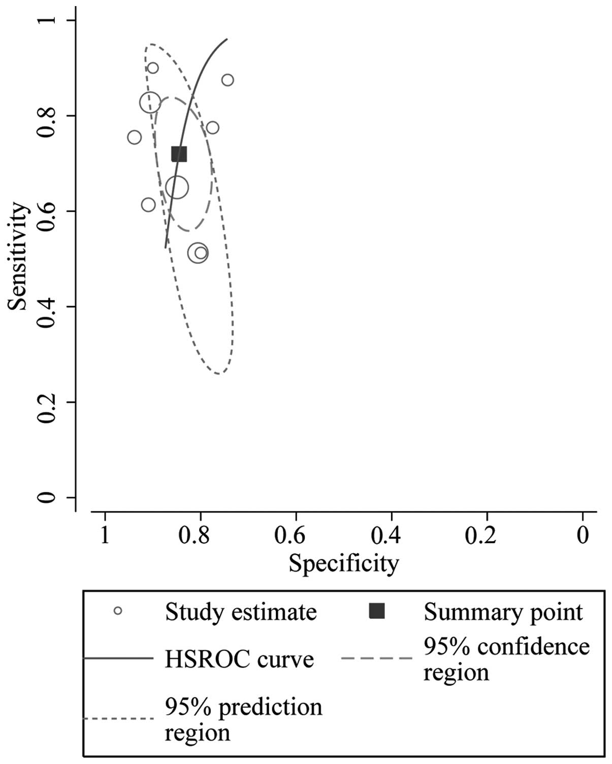 Differences in cut-off values cause the threshold effect. The ROC plane and Spearman rank correlation test is a good approach to assess the threshold effect (18). In the present study, the representation of the sensitivity against the specificity of each study is shown in an ROC space (Fig. 8), which can be used to detect the threshold effect. The pattern of the points in this figure does not suggest a ‘shoulder-arm’ shape, indicating the absence of the threshold effect. A Spearman rank correlation was conducted and the absence of heterogeneity was validated from the threshold effect [Spearman correlation coefficient=0.033; P=0.932 (P>0.05)].