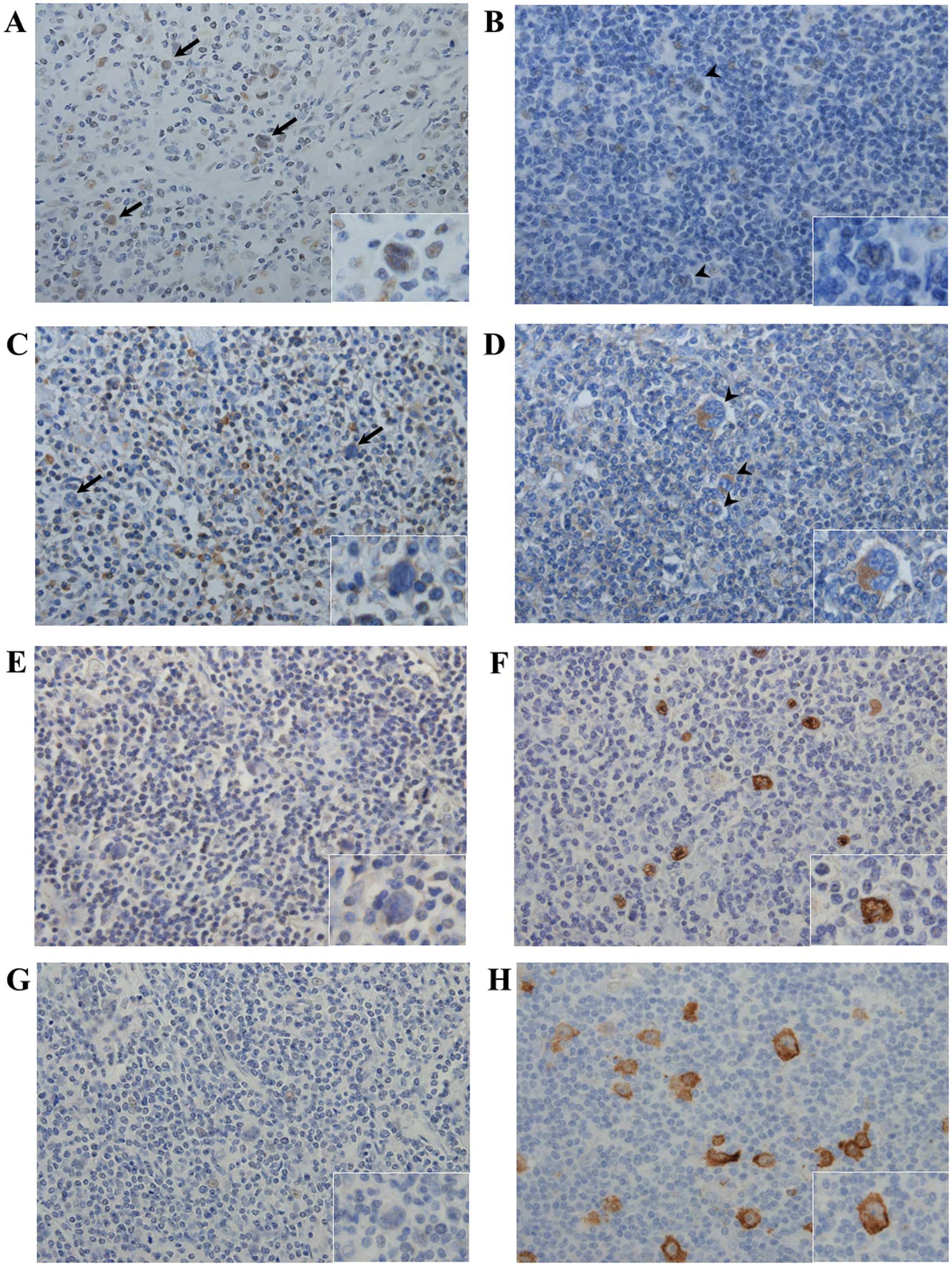 A total of 31 patients diagnosed with HL were investigated following approval of the study protocol by the Institutional Review Board of Osaka University Hospital. The histological subtypes were classified as 15 mixed-cellularity classical HL (MCCHL), 13 nodular sclerosis classical HL (NSCHL), 1 lymphocyte-rich classical HL (LRCHL) and 2 nodular lymphocyte-predominant HL (NLPHL).