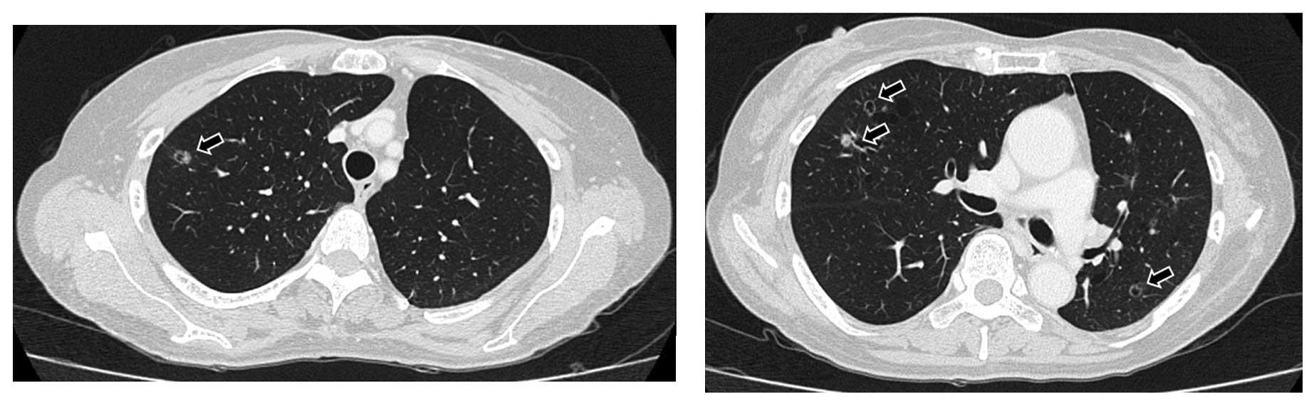 It was recently indicated that pemetrexed-containing chemotherapy exhibits superior efficacy for NSCLCs with specific genetic changes (7–9). Although this is only a case report of an ASCLC patient with EGFR mutation, the outcome in our patient was consistent with the results of other cell types of NSCLC (10).