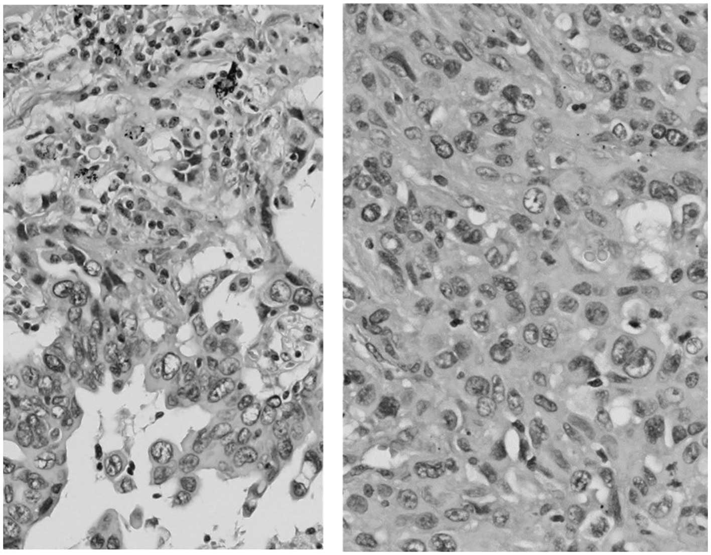 Pleomorphic carcinoma of the lung is a rare, highly malignant tumor, accounting for 0.1–0.4% of primary lung cancer cases (1–3). It has a more aggressive clinical course compared with other types of non-small-cell lung cancer (NSCLC) (4–6), as well as a poorer outcome (4,7,8). We herein report two cases of pleomorphic carcinoma of the lung, who were treated with pemetrexed-containing chemotherapy. Our results demonstrated that pemetrexed-containing chemotherapy may be key to the treatment of advanced cases with this type of lung cancer.