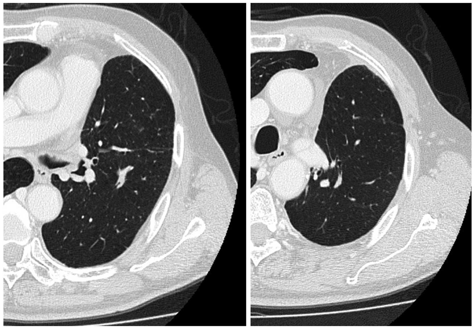 A 68-year-old man was admitted to the hospital with a productive cough. A chest radiograph revealed a tumor 5 cm in diameter in the right lung. Bioptic specimens, which were obtained transbronchially, were diagnosed as NSCLC. As the patient did not present with hilar/mediastinal lymph node enlargement or distant metastasis, he underwent right upper pulmonary lobectomy. On postoperative pathological examination, the tumor was diagnosed as pleomorphic carcinoma of the lung (Fig. 1). The examination for epidermal growth factor receptor mutations was negative. As there was microscopic involvement of the ipsilateral mediastinal lymph nodes, 4 courses of postoperative chemotherapy containing cisplatin and vinorelbine were administered. Four months after the end of the treatment (10 months after the diagnosis), the disease recurred as two pulmonary nodules ≤1 cm in diameter in the left lung, detected on follow-up chest computed tomography (CT) scan (Fig. 2). The work-up for systemic metastasis was negative. Two courses of chemotherapy, consisting of carboplatin [area under the curve (AUC) = 5, day 1, q28 days), pemetrexed (500 mg/m2, day 1, q28 days) and bevacizumab (15 mg/kg, day 1, q28 days) was performed, and the post-treatment evaluation CT scan revealed shrinkage of the two pulmonary lesions (Fig. 3). Thereafter, the patient received an additional two courses of chemotherapy. A follow-up CT scan revealed further shrinkage of the pulmonary tumors. The patient received 20 courses of maintenance chemotherapy consisting of pemetrexed (500 mg/m2, day 1, q28 days) and bevacizumab (15 mg/kg, day 1, q28 days) without any severe adverse events. No recurrence was found and the patient remained well for 30 months after the initiation of the chemotherapy for recurrence; however, the patient succumbed to brain infarction.