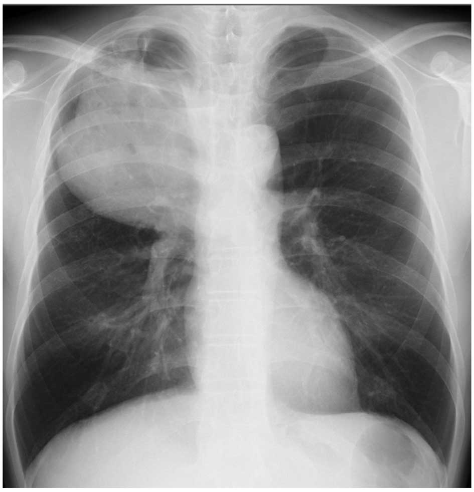 A 46-year-old man was admitted to the hospital with anorexia, fever and weight loss. The blood tests revealed a white blood cell count (WBC) of 22,900/µl with 78% neutrophils, a red blood cell count of 399×104/µl, and a platelet count of 43.2×104/µl. The patient's hemoglobin concentration was 11.5 g/dl and the hematocrit was 34.8%. On the blood chemistry tests, the serum albumin was 2.9 mg/dl, the alkaline phosphatase 348 U/l, the total bilirubin 0.3 mg/dl, and the creatinine 0.57 mg/dl. The serum transaminase levels were within normal limits, and blood serology revealed a C-reactive protein (CRP) level of 15.64 mg/dl. The granulocyte/colony-stimulating factor (G-CSF) level was 246 U/l (normal, ≤39 U/l). A sizeable mass was identified in the upper lobe of the right lung by chest radiography (Fig. 4). A biopsy specimen obtained by video-assisted thoracoscopic surgery revealed a poorly differentiated lung carcinoma. The patient received 4 courses of chemotherapy with carboplatin (AUC=5, day 1, q28 days), pemetrexed (500 mg/m2, day 1, q28 days) and bevacizumab (15 mg/kg, day 1, q28 days), followed by chemoradiotherapy (60 Gy). WBC decreased to within the normal range and fever subsided tentatively for several weeks after each course of chemotherapy. The response was evaluated as ‘stable disease’.