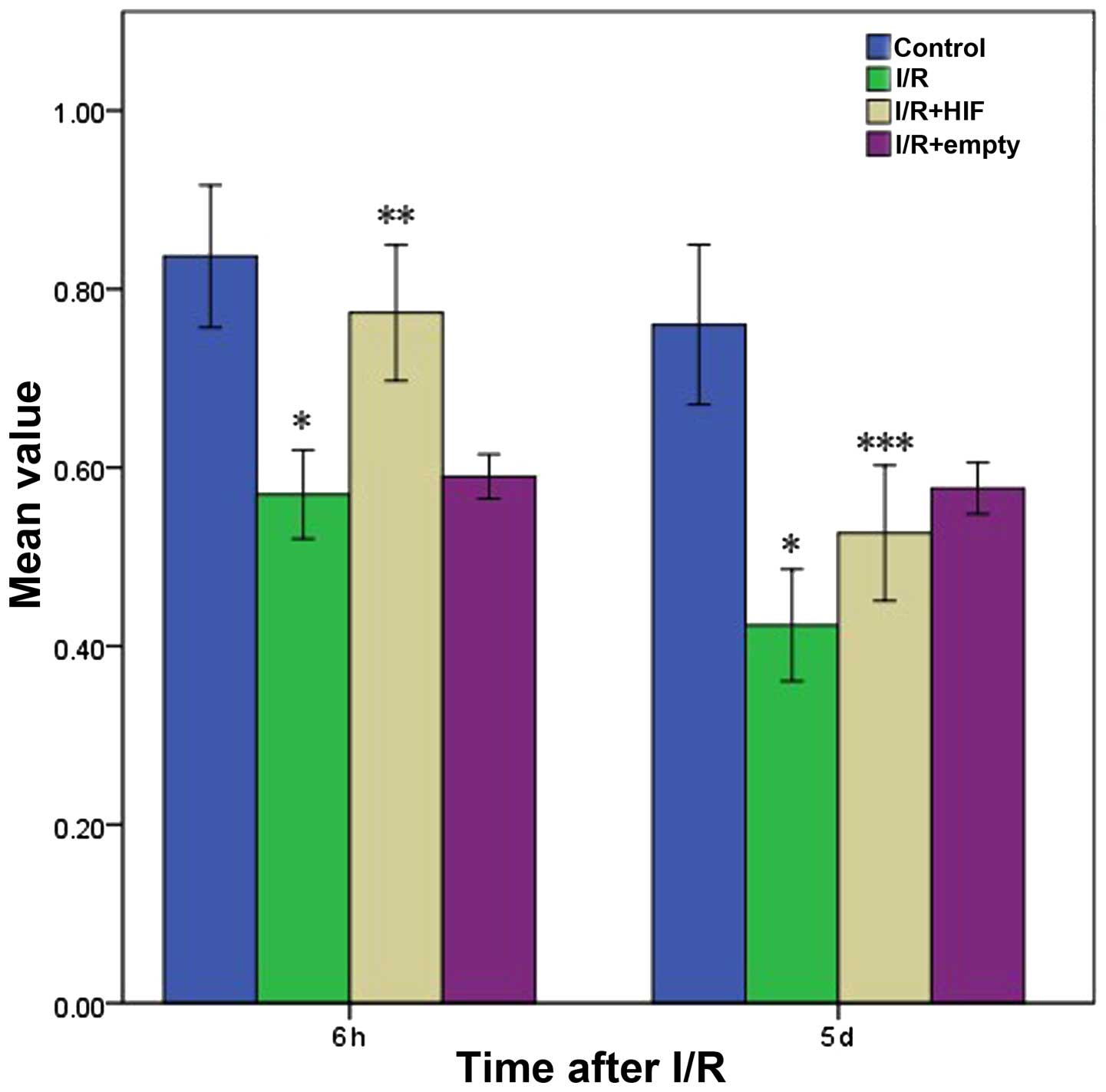 At 6 h following I/R, cell viability was markedly lower in cells subjected to I/R compared with control cells not subjected to I/R, irrespective of whether the cells were untransfected or transfected with empty vector (Fig. 2). Cell viability was markedly higher in cultures transiently transfected with pHIF-1α. At 5 d following I/R, the viability of these cells was much lower than at 6 h, and was only slightly higher than the viability of untransfected cells and cells transfected with empty vector.