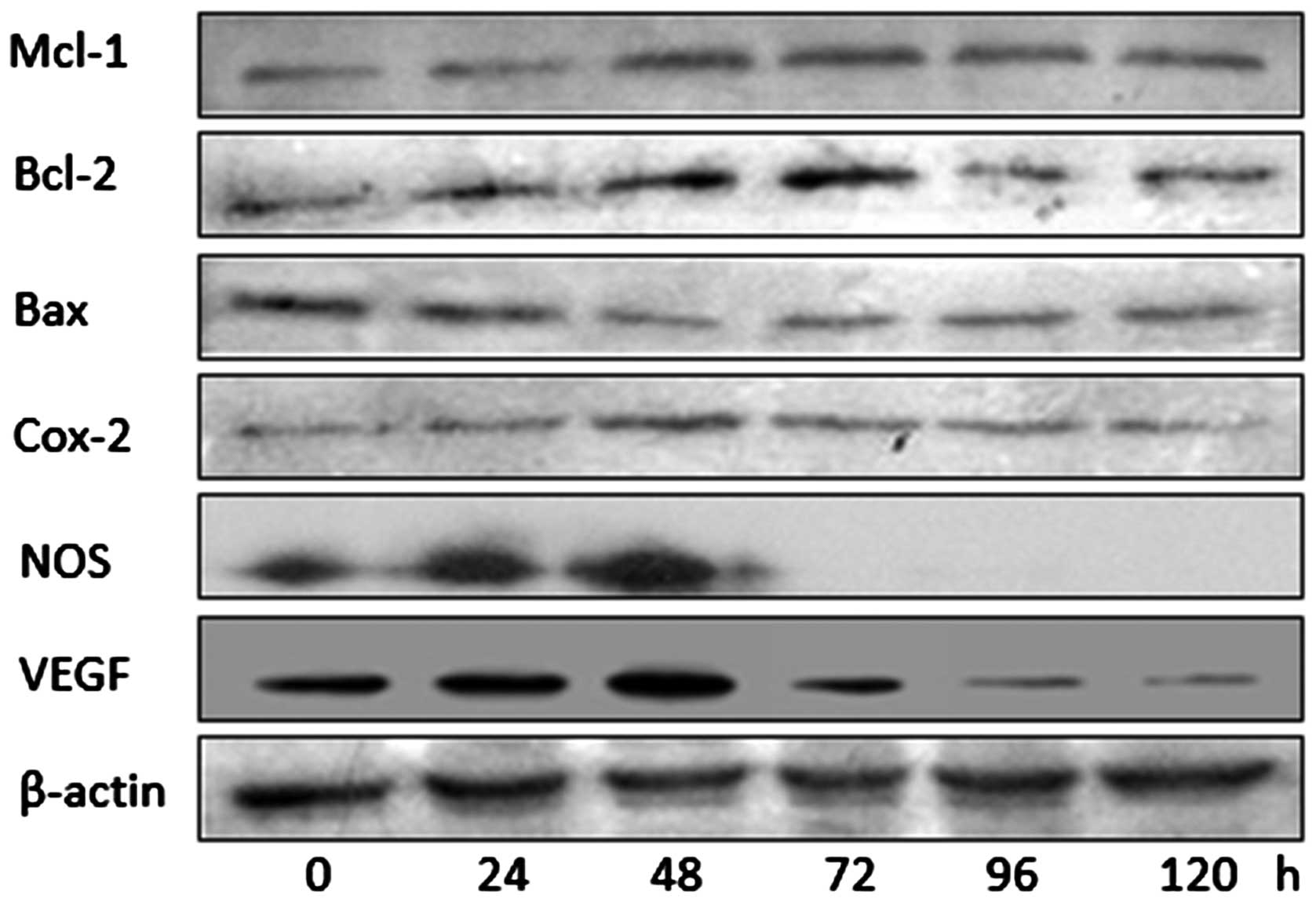 The results in Fig. 3 suggested that the hypoxia-induced upregulation of HIF-1α led to short-term (6 h), but not long-term (5 days), upregulation of VEGF expression. Consequently, it was hypothesized whether the same may also be true for other downstream effector molecules of HIF-1α. Therefore, western blotting was used to assess the levels of B-cell lymphoma-2 (Bcl-2), myeloid cell leukemia 1 (Mcl-1), Bcl-2-associated × protein (Bax), cyclo-oxygenase 2 (Cox-2), nitric oxide synthase (NOS), as well as VEGF at numerous times between 0 and 120 h following I/R in untransfected cells (Fig. 4). These results suggested that, although levels of Bax decreased for much of the time course and potentially increased later, the levels of Mcl-1, Bcl-2, Cox-2, NOS and VEGF peaked at 48–72 h, after which they decreased.