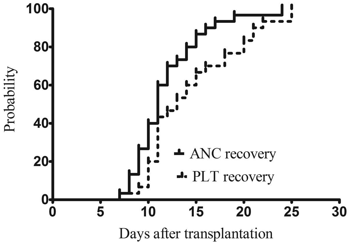 Engraftment was defined as an absolute neutrophil count of >0.5×109/l on the first 3 consecutive days and a platelet count of >20×109/l after at least 3 days without the need for transfusion. Chimeric status was evaluated in nuclear cells of peripheral blood T cells and polymorphonuclear neutrophils on days +20, +30 and +60 by using the short tandem repeat PCR (STR-PCR) method.