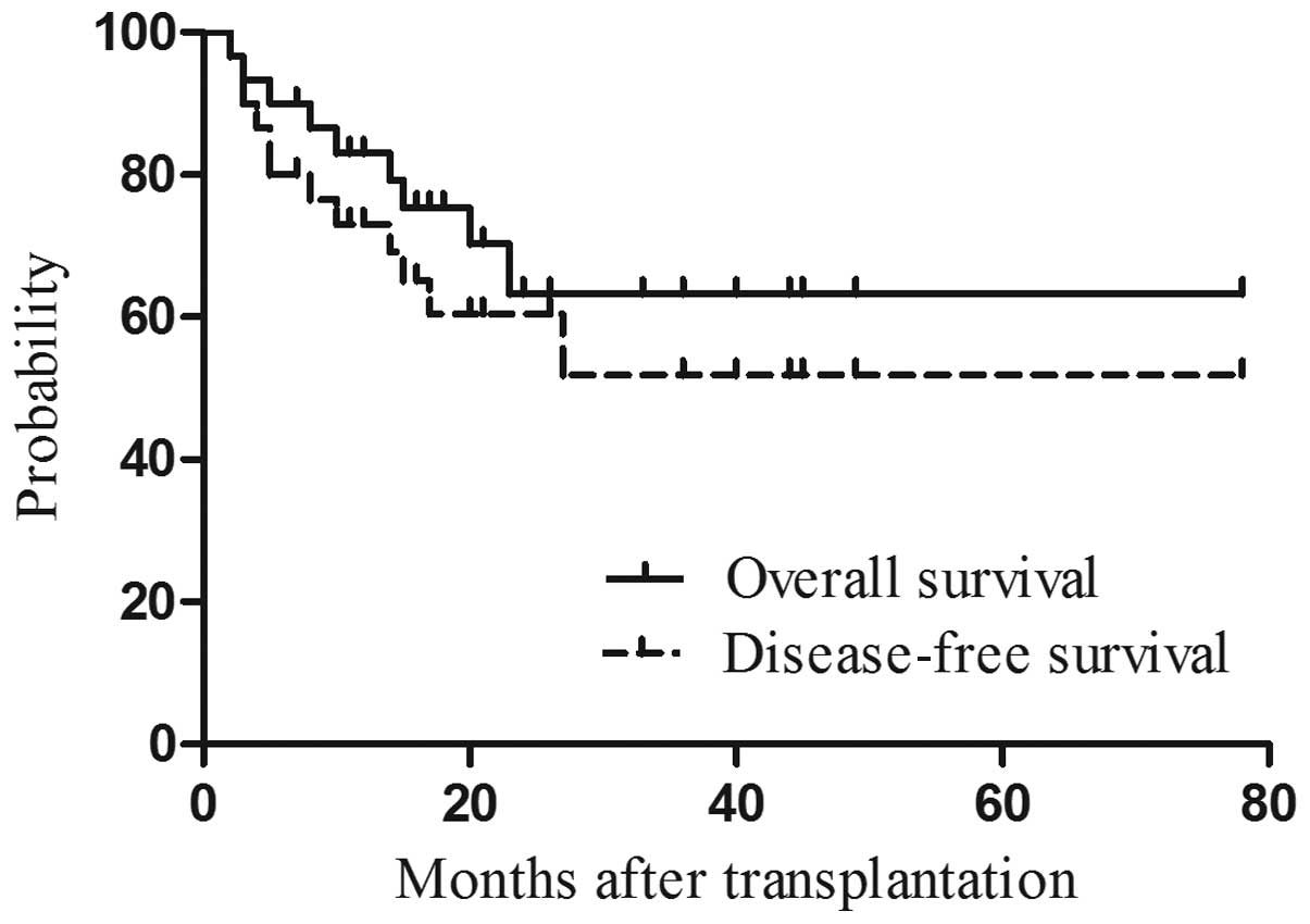 The day of stem cell infusion was defined as day 0. Descriptive statistics were used to describe the baseline characteristics of disease status at conditioning. Categorical variables are summarized as frequency counts and percentages, and continuous variables are summarized as median and range. DFS was defined as the time between transplantation and the earliest occurrence of relapse or death due to any cause. Cumulative incidence or survival was plotted according to the Kaplan-Meier method and the log-rank test was used to analyze differences between groups. Basic statistical data were obtained using the SPSS software package, version 17.0 (SPSS Inc., Chicago, IL, USA). A cut-off value of 0.05 indicating statistically significant differences was adopted for all statistical analyses.