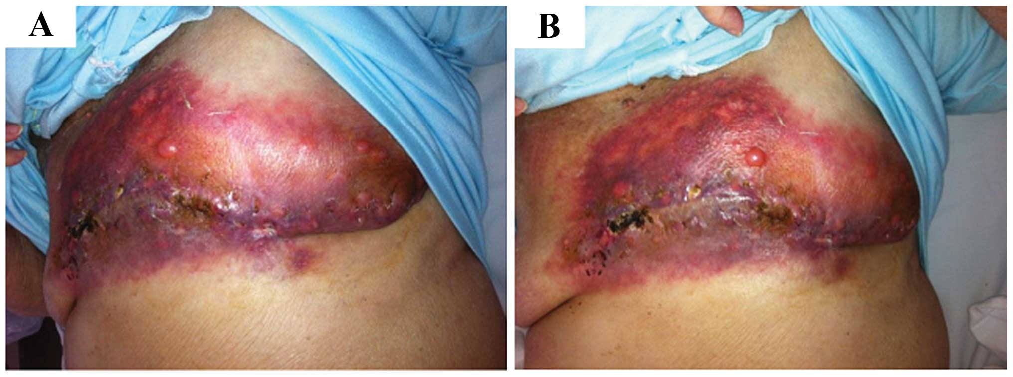 By the time the patient was admitted to our medical center, she already had advanced-stage (IIIb) breast cancer with inflammation/ulceration of the nipple and skin, involvement of the chest wall and metastasis to axillary lymph nodes, but no distant metastatic disease. Neoadjuvant chemotherapy with docetaxel, doxorubicin and cyclophosphamide was administered for cytoreduction in order to render the tumor operable. Chemotherapy not only proved ineffective in that respect, but the CT scans also revealed locoregional progression of the disease and the development of an abscess in the tumor area. Therefore, a palliative simple mastectomy was performed and further chemotherapy was scheduled to treat the residual disease.