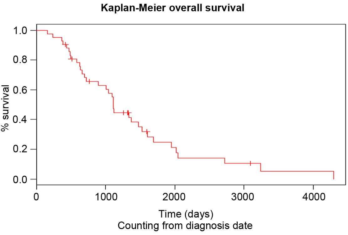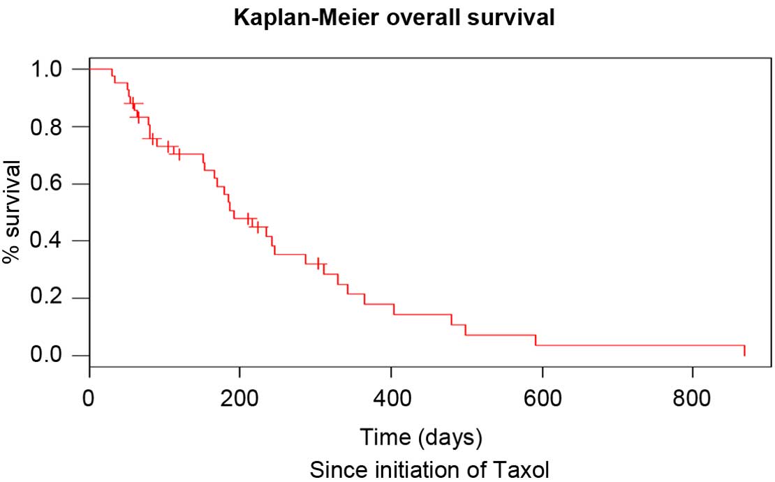 This regimen consisted of weekly intravenous administration of paclitaxel (80 mg/m2) for 3 consecutive weeks, followed by 1 week without treatment. The median duration of this regimen was 3 months. The median number of paclitaxel administrations was seven, which corresponded to the administration of 2.42 cycles. During the observation period, no patients exhibited CR, while 4, 15 and 21 patients met the criteria for PR, SD and PD, respectively (Table II). Therefore, the overall response rate and disease control rate were 9.5 and 45.2%, respectively. It was noted that 26.2% of patients exhibited no favorable outcome and presented with progressive disease following the first cycle of paclitaxel. The median PFS of second-line chemotherapy was 3 months and the median OS following the start of second-line therapy was 6.4 months (Table II). The PFS following second-line therapy was shorter compared with that following first-line therapy (log rank, P<0.05). The OS of patients since diagnosis and since initiation of paclitaxel treatment is shown in Figs. 1 and 2, respectively. The neutrophil to lymphocyte (N/l) ratio at diagnosis was not statistically correlated with the OS of the patients (P=0.96). At the initiation of paclitaxel, the cut-off value for this ratio was 4.62 and was also not prognostic for the OS (P=0.34). In addition, no statistically significant difference was observed between male and female patients (P=0.722).