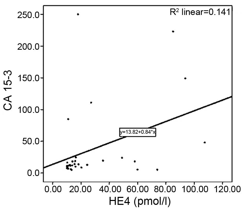 Furthermore, a positive correlation was determined between the serum levels of HE4 and CA 15–3 in breast cancer patients (r=0.399; P=0.026) (Fig. 2).