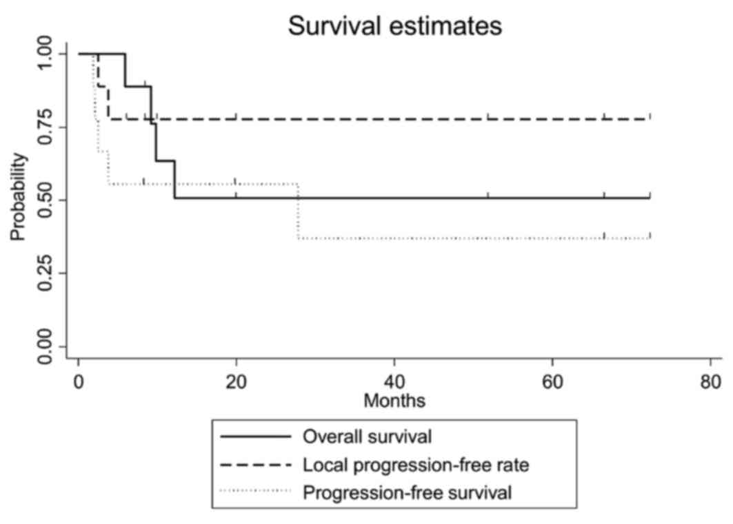 The overall survival time was calculated from the first day of brachytherapy to the date of death from any cause. Hospital visits provided data on surviving patients. The progression-free survival time was calculated from the first day of brachytherapy to the date of the first relapse at any site or the date of death. The local progression-free rate was calculated according to to the date of relapse in irradiated sites. Survival time was calculated using the Kaplan-Meier method and the difference was compared using the log-rank test. Paired variables were compared by the Wilcoxon matched-paired signed-rank test. Stata statistical software, version 13 (StataCorp., College Station, TX USA) was used. A probability value of <0.05 was considered to be statistically significant.