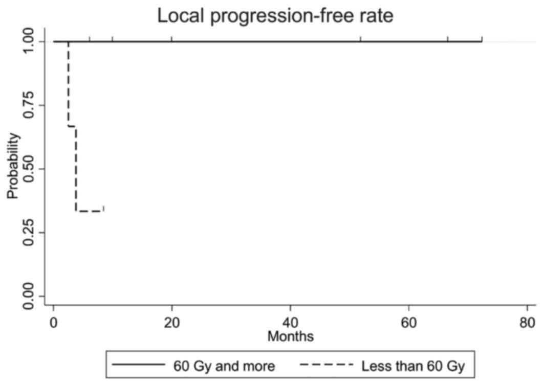 In the present study, a dose of ≥60 Gy achieved significantly better local control compared with a dose of <60 Gy. Of the 9 patients who underwent brachytherapy of ≥60 Gy at the 50% dose (D50%), 3 survived. Hata et al also reported results with definitive external radiotherapy for 17 patients (10). All the tumors regressed with radiotherapy; however, 2 patients had a local relapse and 5 relapsed at other sites of the scalp. The authors reported that a dose of 50–60 Gy at 2 Gy per fraction attained local control when the tumor did not invade deeper tissues. Ogawa et al reported clinical results from 14 patients treated with definitive radiotherapy: The 10 patients who received a dose of ≥70 Gy did not develop local relapse, but 4 patients who received a dose of <70 Gy relapsed. Of the 11 patients treated with surgery followed by radiotherapy, none relapsed with a dose of ≥60 Gy, but 2 relapsed when a dose of <60 Gy was administered (12). Based on those results and ours combined, a brachytherapy dose of 60 Gy may be adequate to obtain good local control for angiosarcoma.