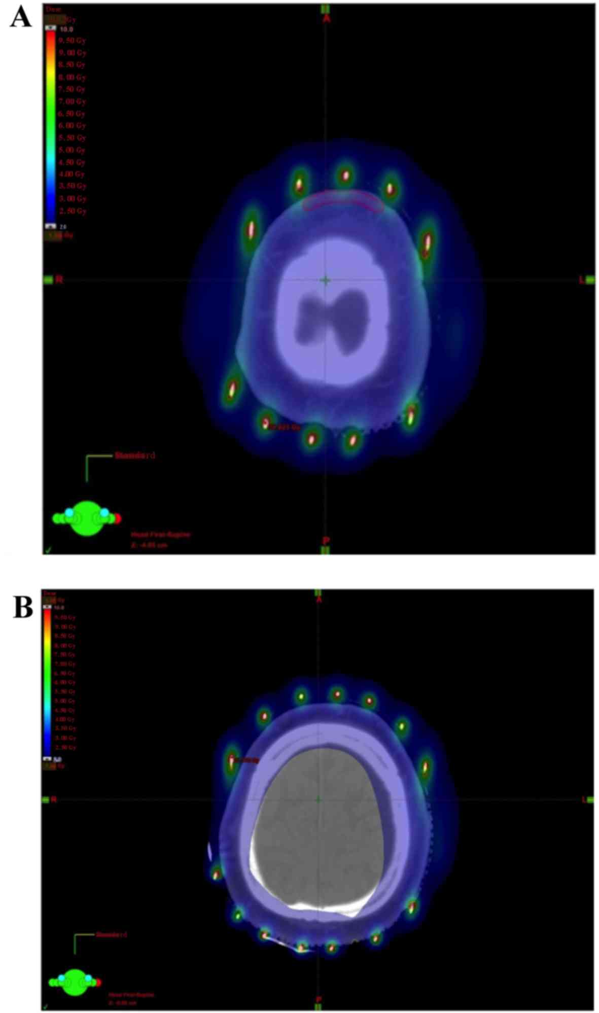 Doses of 100, 95, 90, 85, 80, 70, 60, 50, 10 and 5% of the PTV and the maximal doses were evaluated in the skull, cerebrum and cerebellum using the BrachyVision brachytherapy 3-dimensional planning system (Varian Medical Systems Inc.). The data were used for necessary dose analysis.