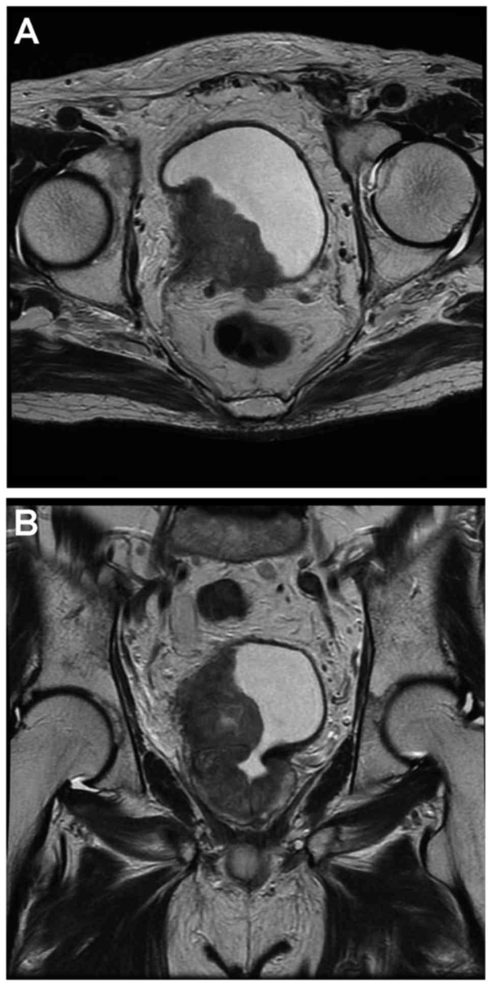 An 89-year-old male visited a local hospital with the chief complaint of gross hematuria and voiding difficulty. The patient had no past medical history and was not taking any anticoagulants. Computed tomography of the abdomen and pelvis showed a tumor on the right wall of the bladder and a right hydronephrotic atrophic kidney caused by tumor obstruction. The serum creatinine level was elevated to 1.44 mg/dl (normal range, 0.43–1.08 mg/dl) (Fig. 1). Magnetic resonance imaging showed that the bladder tumor was invading the perivesical tissue macroscopically (Fig. 2). The patient was referred to Saitama Medical University International Medical Center (Saitama, Japan) for treatment.