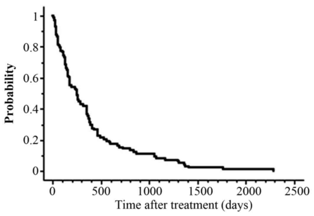 Data for continuous variables are presented as median (range). All statistical analyses were performed using StatView 5.0 statistical software (SAS Institute, Inc., Cary, NC, USA). Survival data were estimated by using the Kaplan-Meier method and examined for significance using the log-rank test. Cut-off values were set as the average or median value of each variable unless otherwise stated. Coxs proportional hazard model was used for the multivariate analysis. For all analyses, P<0.05 was considered to indicate a statistically significant difference.