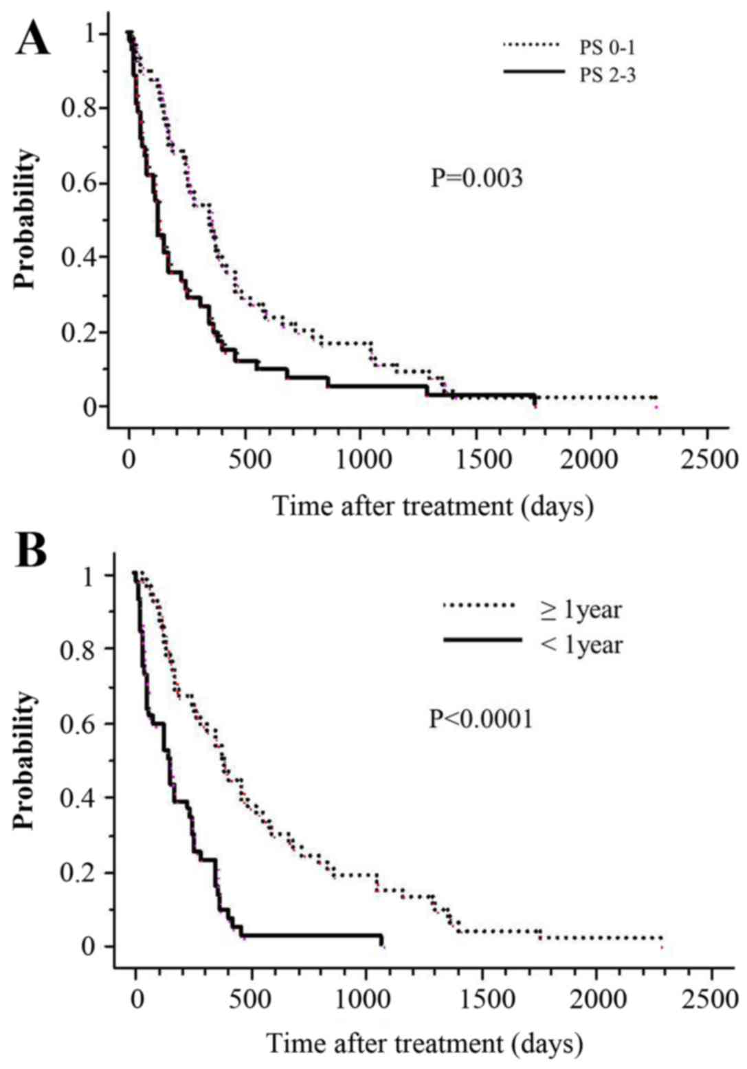 The present study found a favorable 1-year OS rate of 36%, and the MST following Re-RT for the entire series was 255 days (range, 7–2,285 days). Hayashi et al (3) found that the MST after Re-RT was of 4 months. Similarly, Hernanz et al (13) identified that the MST following Re-RT was of 3 months. Additionally, they noted that the survival was significantly longer when the interval between initial RT and Re-RT was >1 year (13). It must be noted that the results of the present study are consistent with those of this previous report. Other factors, such as Karnofsky Performance Status prior to treatment or the administered BED were not significantly associated with survival in their study (13). In the present study, multivariate analysis revealed that not only the intervals between initial RT and Re-RT but also PS at the time of Re-RT were observed as statistically significant prognostic factors. The finding of PS as a prognostic factor in the current study is consistent with certain previous reports (14,15).