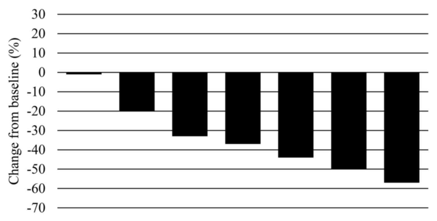The patient characteristics are summarized in Table I. The median patient age was 71 years (range, 59–78 years), and the subjects comprised 1 male and 6 female LURPC patients. The tumor was located at the body of the pancreas in 1 and in the head of the pancreas in 6 subjects. The criteria for diagnosing a case as unresectable were as follows: Solid tumor in contact with the celiac axis >180° in 3 subjects, solid tumor in contact with the common hepatic artery with extension to the hepatic artery bifurcation in 2 subjects, an unreconstructible portal vein due to tumor involvement in 1 subject, and an unreconstructible portal vein/superior mesenteric vein involvement in 1 subject. The patients underwent a median of 4 (range, 2–7) courses of chemotherapy. No patients achieved a complete response, 5 achieved a partial response, 2 had stable disease, and none had progressive disease. The response rate was 71% (Fig. 1).