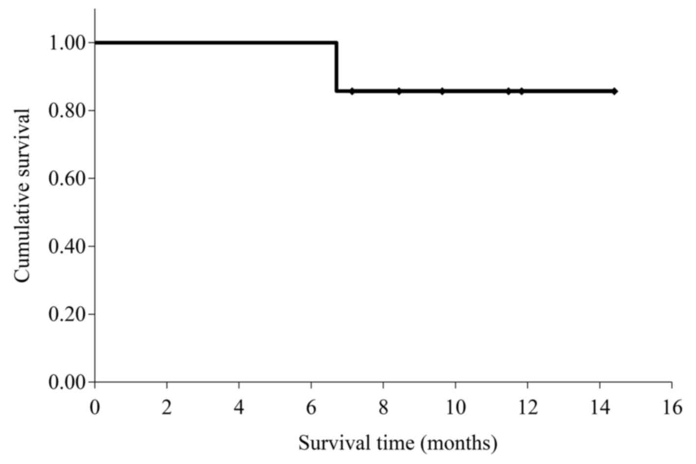 The therapeutic effects of the combination treatment are summarized in Table II. The median tumor diameter significantly decreased from 35 mm (range, 24–60 mm) prior to treatment to 22 mm (range, 20–35 mm) following treatment (P=0.008); the median rate of tumor shrinkage was 37% (range, 0–57%). The mean serum CA19-9 values significantly decreased from 767 U/ml (14–1977 U/ml) prior to treatment to 35 U/ml (range, 14–123 U/ml) following treatment (P=0.038); the median rate of reduction was 92% (range, 47–98%). When the 5 subjects who achieved a partial response were examined, 2 were diagnosed with resectable cancer and both underwent radical R0 resection. Peritoneal dissemination was observed in 1 patient 2 months after surgery; despite initiating treatment, the patient succumbed to the disease 1 month later. Another patient was found to be recurrence-free during the 3-month follow-up, and S-1 was administered as ongoing postoperative adjuvant chemotherapy. The mean survival time for the 7 patients was 13.3 months [95% confidence interval (CI): 11.3–15.3; Fig. 2].