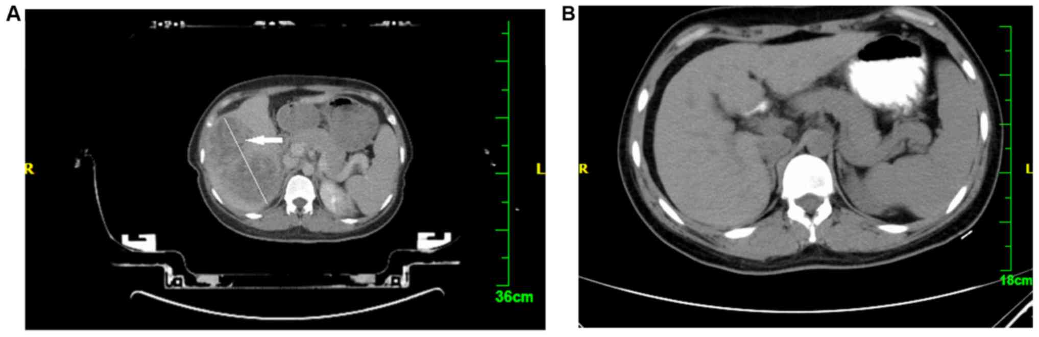 Historically, the liver has been considered to be a relatively radiosensitive organ and it may be difficult to achieve the radiation doses required to eradicate gross tumors without causing RILD, which generally develops ~4–8 weeks following RT (9). The higher incidence of RILD in this study may be associated with the sizeable tumor and the single integral high dose and high total dose of RT. The curative effect of massive liver cancer was significant. As seen in Fig. 1, showing a pre- and post-treatment CT, the liver displayed a sizeable shadow prior to treatment, whereas the shadow completely disappeared following RT. The reason for this significant shrinking or disappearance of the tumor may be associated with high division of a single dose and the total dose.