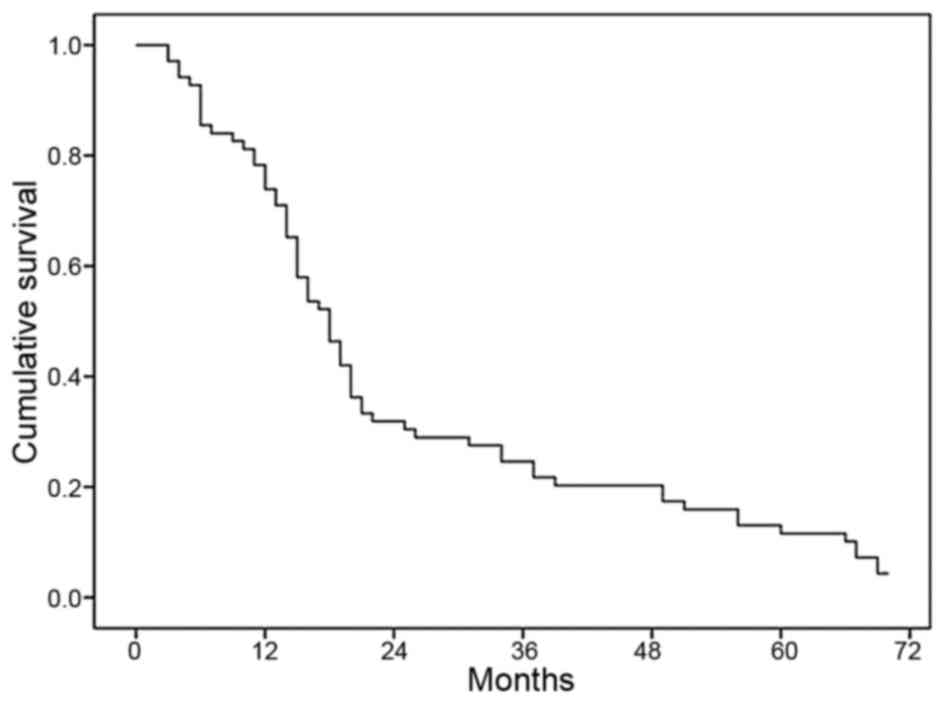The overall survival of patients with massive primary liver cancer following RT is shown in Fig. 4. The median survival was 17.4 months for all patients included in the study and the 1-, 2- and 3-year overall survival rates were 71, 30 and 22%, respectively.