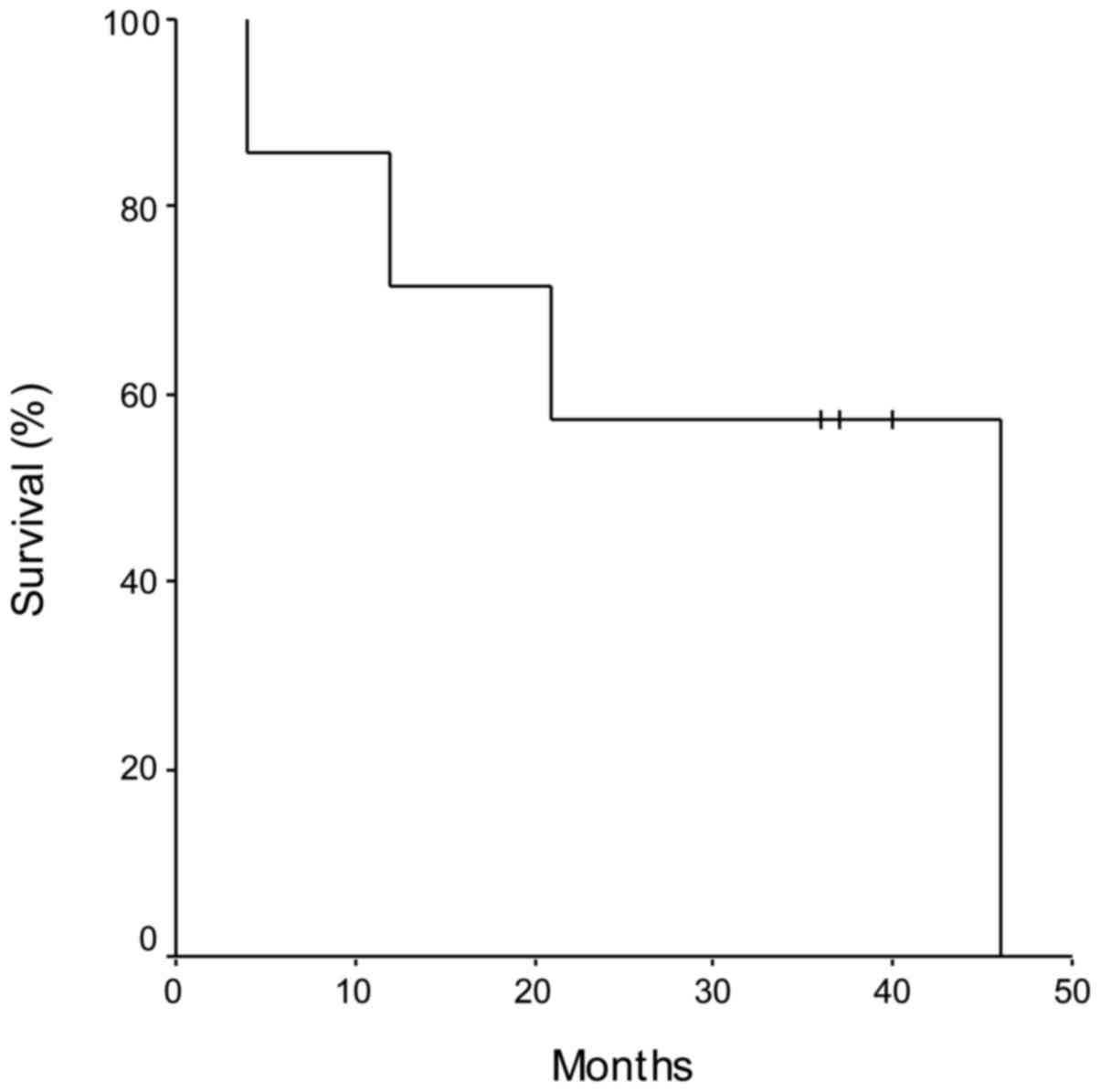 Using Kaplan-Meier analysis, the PFS, calculated as the time from liver resection and the disease progression, was 11 months (range, 3–21 months), whereas the OS was 31 months (range, 4–46 months) (Fig. 1). Patients who demonstrated a significant advantage in OS were those subjected to further liver surgery (patient nos. 3 and 6, equal to 40 and 37 months, respectively), and to subsequent lines of CT, confirming the importance of a multidisciplinary approach to the treatment of mCRC (Table I).