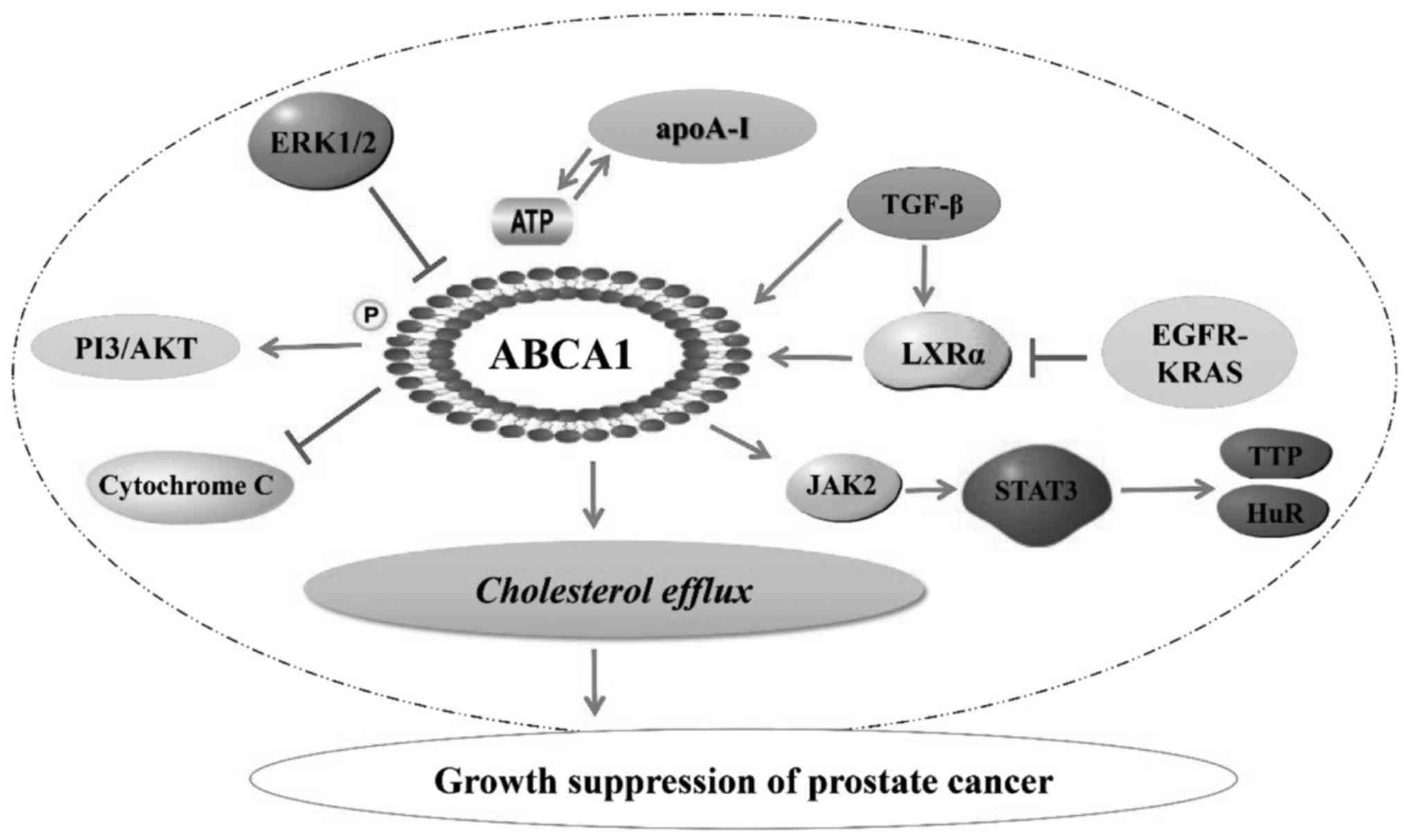 Hypermethylation of the ABCA1 promoter has been shown to silence ABCA1 expression and is associated with high-grade prostate cancer (27). The interaction of apoA-I with ABCA1 activates the signaling molecule Janus kinase 2 (JAK2), which optimizes the cholesterol efflux activity of ABCA1 by phosphorylation (28). ABCA1-mediated JAK2 activation also activates signal transducer and activator of transcription 3 (STAT3), which significantly attenuates the expression of proinflammatory cytokines in macrophages. The anti-inflammatory effects of the apoA-I/ABCA1/STAT3 pathway, however, is dependent on the activity of suppressor of cytokine signaling 3. Taken together, these findings suggest that the interaction of apoA-I/ABCA1 activates cholesterol efflux and STAT3 branching pathways to synergistically inhibit inflammation in macrophages (29). It was also demonstrated that the apoA-I/ABCA1 interaction with the JAK2/STAT3 pathway to inhibit macrophage inflammatory responses is independent of ABCA1 lipid transport function. ABCA1 mutation carriers also exhibit an increased incidence of systemic and plaque inflammation (30). It has been observed that aberrant regulation of tristetraprolin and human antigen R plays an important role in the progression of prostate cancer and other inflammation-related cancers, as well as in cancer cell proliferation, apoptosis, angiogenesis, invasion and chemoresistance (31).