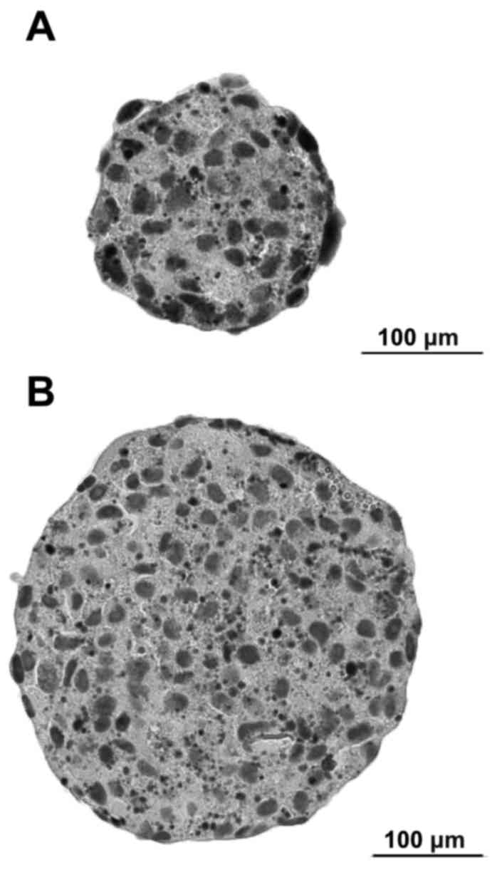 The present results are contrary to those described by Adcock and colleagues, who described an increased average spheroid diameter with an increasing initial cell number per well plate, using the CAL-27 cell line from the tongue squamous cell carcinoma (2). While 5,000 BHY cells, resulted in one compact spheroid, adding 10,000 or 15,000 cells to each well plate led to the formation of small aggregates of cells, instead of one compact spheroid in our investigation.